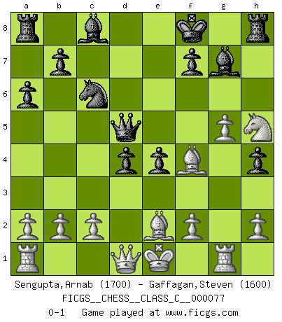 Last move : 0-1 2008 August 18 18:27:12 [Event "FICGS__CHESS__CLASS_C__000077"] [Site "FICGS"] [Date "2008.04.05"] [Round "1"] [White "Sengupta,Arnab"] [Black "Gaffagan,Steven"] [Result "0-1"] [WhiteElo "1700"] [BlackElo "1600"] 1.e4 c5 2.Nf3 d6 3.d4 cxd4 4.Nxd4 Nf6 5.Nc3 a6 6.Be3 e6 7.g4 e5 8.Nf5 h5 9.g5 Nxe4 10.Nxg7+ Bxg7 11.Nxe4 d5 12.Ng3 d4 13.Bd2 Qd5 14.Be2 e4 15.Bf4 h4 16.Nh5 Kf8 17.Rg1 Nc6 0-1 Sicilian : Najdorf, Byrne (English) attack Player Black won this chess game. Follow this game move after move (download)Fischer, who may or may not be mad as a hatter, has every right to be horrified. (Jeremy Silman) Ich liebe den Moment, wenn ich das Ego meines Gegenüber breche. (Robert James Fischer) En el tablero, la mentira e hipocresía no sobreviven mucho. (Emanuel Lasker) Les échecs, c'est l'imagination. (David Bronstein) Optimism is a variety of information deficit. Sometimes especially true for correspondence chess games. (Michael Aigner)