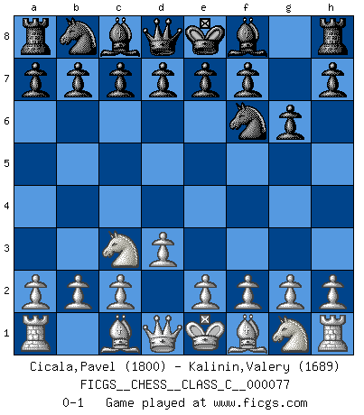 Last move : 0-1 2008 May 17 10:8:22 [Event "FICGS__CHESS__CLASS_C__000077"] [Site "FICGS"] [Date "2008.04.05"] [Round "1"] [White "Cicala,Pavel"] [Black "Kalinin,Valery"] [Result "0-1"] [WhiteElo "1800"] [BlackElo "1689"] 1.d3 Nf6 2.Nc3 g6 0-1 This chess game has been lost on time (started : 2008.04.05 13:50:13) Mieses Opening Player Black won this chess game. Follow this game move after move (download)There are two classes of men; those who are content to yield to circumstances and who play whist; those who aim to control circumstances, and who play Chess. (Mortimer Collins) Strategie ist, wie man ein Mädchen auf den Rücksitz bekommt. Taktik ist, was man tut, wenn man dann dort ist. (Anonymous) Vive, pierde y aprende al observar a tu oponente como gana. (Amber Steenbock) Ce n'est pas pour s'amuser qu'il joue aux échecs : il célèbre un culte. (Vladimir Nabokov) Shallow men believe in luck. Strong men belive in cause and effect. (Ralph Waldo Emerson)