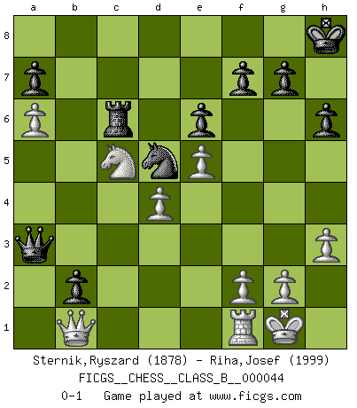Last move : 0-1 2008 April 21 12:13:6 [Event "FICGS__CHESS__CLASS_B__000044"] [Site "FICGS"] [Date "2008.04.06"] [Round "1"] [White "Sternik,Ryszard"] [Black "Riha,Josef"] [Result "0-1"] [WhiteElo "1878"] [BlackElo "1999"] 1.e4 e6 2.d4 d5 3.e5 c5 4.c3 Nc6 5.Nf3 Qb6 6.a3 c4 7.Nbd2 Na5 8.b4 cxb3 9.Bb2 Bd7 10.c4 dxc4 11.Nxc4 Nxc4 12.Bxc4 Ne7 13.O-O Nd5 14.a4 Rc8 15.a5 Qb4 16.Bxb3 Qb5 17.Ng5 Be7 18.Ne4 O-O 19.Qf3 Bc6 20.Rfb1 Rfd8 21.Ba4 Qc4 22.Bxc6 Rxc6 23.Rc1 Qa6 24.Rd1 Rdc8 25.Ba3 Bxa3 26.Rxa3 Rc1 27.h3 Rxd1+ 28.Qxd1 b5 29.Nc5 Qc6 30.Qd2 Ne7 31.Qb2 Rb8 32.a6 b4 33.Rd3 Qb5 34.Qc2 h6 35.Rd1 Rd8 36.Nb7 Rc8 37.Qd2 Rc3 38.Nd6 Qa4 39.Ne4 Rc2 40.Qd3 Nd5 41.Nc5 Qa2 42.Qf3 Rc3 43.Qg4 Kh7 44.Qe4+ Kh8 45.Rf1 b3 46.Qb1 Qa3 47.Ne4 Rc6 48.Nc5 b2 0-1 French : Advance, Paulsen attack Kingside Castling by player White (move 13) Kingside Castling by player Black (move 18) Player Black won this chess game. Follow this game move after move (download)Not all artists are Chess players, but all Chess players are artists. (Marcel Duchamp) Lisa Lane, amerikanische Schachmeisterin, hatte Fischer einmal als stärksten lebenden Spieler bezeichnet. Antwort: Das ist richtig, aber Lisa Lane ist eigentlich nicht in der Lage, das zu beurteilen. (Robert James Fischer) Muchos jugadores de Ajedrez se sorprendían cuando después de la partida, Fischer explicaba con calma: 'Yo ya había analizado esta posibilidad' en una posición en la cual yo creía que no era posible de prever desde la apertura. (Mikhail Tal) Aidez vos pièces, elles vous aideront. (Paul Morphy) However beautiful the strategy, you should occasionally look at the results. (Winston Churchill)