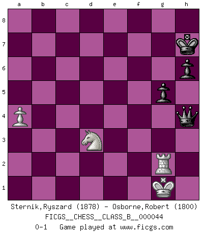 Last move : 0-1 2008 May 22 16:50:15 [Event "FICGS__CHESS__CLASS_B__000044"] [Site "FICGS"] [Date "2008.04.06"] [Round "1"] [White "Sternik,Ryszard"] [Black "Osborne,Robert"] [Result "0-1"] [WhiteElo "1878"] [BlackElo "1800"] 1.e4 c5 2.Nf3 d6 3.d4 cxd4 4.Nxd4 Nf6 5.Nc3 a6 6.Be2 e5 7.Nb3 Be7 8.O-O O-O 9.Kh1 Nc6 10.f4 a5 11.a4 Nb4 12.Bf3 Be6 13.Be3 Re8 14.Qd2 Qc8 15.Rac1 h6 16.Rfd1 Ng4 17.Bxg4 Bxg4 18.Rf1 Ra6 19.f5 Rd8 20.Qf2 d5 21.Bb6 d4 22.Bxd8 Qxd8 23.Qg3 Bg5 24.Nd5 Be2 25.Qxe5 d3 26.Rg1 Rd6 27.cxd3 Nxd3 28.Qd4 Bf4 29.f6 Rxd5 30.exd5 Be5 31.Qe3 Qxf6 32.Rc8+ Kh7 33.Re8 Nf2+ 34.Qxf2 Qxf2 35.Rxe5 Bf3 36.Nxa5 f6 37.Re8 Bxd5 38.Rd8 Qd4 39.Nxb7 f5 40.b4 f4 41.Rxd5 Qxd5 42.Nc5 f3 43.gxf3 Qxf3+ 44.Rg2 Qf5 45.h4 Qb1+ 46.Kh2 Qxb4 47.Nd3 Qxh4+ 48.Kg1 g5 0-1 Sicilian : Najdorf, Opovcensky variation Kingside Castling by player White (move 8) Kingside Castling by player Black (move 8) 10 pieces endgame at move 43 : White KRNPPP , Black KQPP WHITE : King + 1 Rook 1 Knight 3 Pawns BLACK : King + 1 Queen 2 Pawns 9 pieces endgame at move 46 : White KRNPP , Black KQPP WHITE : King + 1 Rook 1 Knight 2 Pawns BLACK : King + 1 Queen 2 Pawns 8 pieces endgame at move 47 : White KRNP , Black KQPP WHITE : King + 1 Rook 1 Knight 1 Pawn BLACK : King + 1 Queen 2 Pawns Player Black won this chess game. Follow this game move after move (download)When you are lonely, when you feel yourself an alien in the world, play Chess. This will raise your spirits and be your counselor in war. (Aristotle) Wie bekannt hörte Morphy 1859 auf, Schach zu spielen. Seine Enttäuschung galt nicht so sehr dem Schach, wie den Schachspielern. (Robert James Fischer) La pasion por jugar al Ajedrez es una de las mas inexplicables en el mundo. (H.G. Wells) Mais n'est-ce pas déjà le limiter injurieusement que d'appeler les échecs un jeu? N'est-ce pas aussi une science, un art, ou quelque chose qui, comme le cercueil de Mahomet entre ciel et terre, est suspendu entre l'un et l'autre, et qui réunit un nombre incroyable de contraires ? (Stefan Zweig) If only faces could talk... (Pat Summerall, Sportscaster during the Super Bowl)