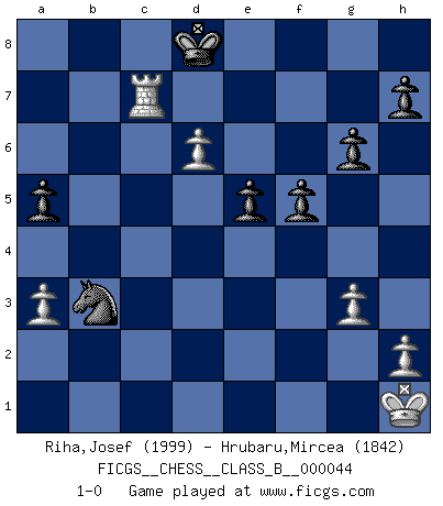 Last move : 1-0 2008 August 3 22:35:17 [Event "FICGS__CHESS__CLASS_B__000044"] [Site "FICGS"] [Date "2008.04.06"] [Round "1"] [White "Riha,Josef"] [Black "Hrubaru,Mircea"] [Result "1-0"] [WhiteElo "1999"] [BlackElo "1842"] 1.g3 g6 2.Bg2 Bg7 3.c4 Nf6 4.Nf3 O-O 5.d4 a6 6.O-O d6 7.Nc3 Nc6 8.d5 Na5 9.Nd2 c5 10.Qc2 Rb8 11.b3 b5 12.Bb2 Bh6 13.f4 bxc4 14.bxc4 Ng4 15.Nd1 Rxb2 16.Qxb2 Bg7 17.Qc1 Bd4+ 18.Kh1 Bxa1 19.Qxa1 Qb6 20.Qc3 Qb4 21.Qd3 Bd7 22.Bf3 Nf6 23.a3 Qb6 24.Qc3 Bh3 25.Rg1 Ng4 26.e4 Nb7 27.Bxg4 Bxg4 28.Ne3 Bc8 29.e5 dxe5 30.fxe5 f6 31.Rb1 Qa5 32.Qxa5 Nxa5 33.e6 f5 34.Nd1 Kg7 35.Nc3 Kf6 36.Na4 Ke5 37.Nxc5 Kd4 38.Nd7 Bxd7 39.exd7 Rd8 40.Nf3+ Kxc4 41.Ne5+ Kc5 42.Rc1+ Kd6 43.Nf7+ Kxd7 44.Nxd8 Kxd8 45.Rc5 Nb3 46.Rc6 a5 47.d6 e5 48.Rc7 1-0 Benko's Opening Kingside Castling by player Black (move 4) Kingside Castling by player White (move 6) Player White won this chess game. Follow this game move after move (download)A big shock; the best chess player in history has passed away. (Lajos Portisch, about Bobby Fischer's death) Ich bin der einzige Schachspieler, der sich während der Vorbereitungen zum Turnier verletzt hat. (Woody Allen) El Ajedrez es 99 por ciento táctica. (Teichmann) Toutes les manuvres exécutées sur une colonne ouverte ont pour but ultime l'intrusion définitive sur la septième ou la huitième rangée, en plein cur de la position ennemie. (Aaron Nimzovitch) When the going gets tactical, the computers get going. (Hyatt)