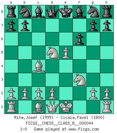Last move : 1-0 2008 May 16 22:6:16 [Event "FICGS__CHESS__CLASS_B__000044"] [Site "FICGS"] [Date "2008.04.06"] [Round "1"] [White "Riha,Josef"] [Black "Cicala,Pavel"] [Result "1-0"] [WhiteElo "1999"] [BlackElo "1800"] 1.e4 e5 2.Nc3 Nf6 3.f4 c6 4.fxe5 Ng8 5.Nf3 f6 6.Bc4 d5 7.exd5 cxd5 8.Nxd5 1-0 This chess game has been lost on time (started : 2008.04.06 1:20:27) Vienna : Falkbeer variation Player White won this chess game. Follow this game move after move (download)Don't even mention losing to me. I can't stand to think of it. (Bobby Fischer) Smyslow ist ein Beweis dafür, dass ich noch zehn Jahre spielen kann! [der 75 jährige über den 85 jährigen] (Viktor Kortschnoi) En el tablero, la mentira e hipocresía no sobreviven mucho. (Emanuel Lasker) Donnez-moi un Cavalier en 6e et je gagnerais toutes mes parties. (Steinitz) Hold em is to stud what chess is to checkers. (Johnny Moss)