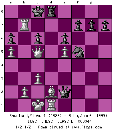 Last move : 1/2-1/2 2008 May 12 22:28:22 [Event "FICGS__CHESS__CLASS_B__000044"] [Site "FICGS"] [Date "2008.04.06"] [Round "1"] [White "Sharland,Michael"] [Black "Riha,Josef"] [Result "1/2-1/2"] [WhiteElo "1886"] [BlackElo "1999"] 1.e4 e6 2.d4 d5 3.Nc3 Bb4 4.e5 c5 5.Qg4 Ne7 6.dxc5 Nbc6 7.Nf3 d4 8.Bb5 Qa5 9.Bxc6+ bxc6 10.Qxd4 Nf5 11.Qc4 Ba6 12.Qb3 Qb5 13.Kd1 Qxc5 14.Bd2 Qxf2 15.Qxb4 Qxg2 16.Re1 Qxf3+ 17.Kc1 O-O-O 18.Ne4 Qg2 19.Nc5 Rd4 20.Qa5 Bb7 21.Rd1 Kb8 22.c3 Rd5 23.Qb4 Rxc5 24.Qxc5 Rd8 25.a4 Qxh2 26.a5 a6 27.Ra4 Qe2 28.Rb4 Kc8 29.Rxb7 1/2-1/2 French : Winawer, Advance, Russian variation Queenside Castling by player Black (move 17) This chess game ended in a draw. Follow this game move after move (download)The winner of the game is the player who makes the next-to-last mistake. (Savielly Tartakover) Es gibt keine einzige Frau, der ich nicht einen Springer vorgeben könnte und trotzdem gewänne. (Robert James Fischer) Con el tiempo, empecé a progresar en partidas decisivas. Tal vez porque me di cuenta de una simple verdad: no solo estaba yo nervioso sino también mi oponente. (Mikhail Tal) Lorsque vous vous retrouvez devant une position atroce, ne tendez pas un ultime piège dérisoire avec l'intention d'abandonner si l'adversaire le déjoue ! Faites-vous plutôt un devoir de résister comme si votre vie en dépendait. Jouez le coup qui vous déplairait au centuple si vous étiez dans la peau de votre tortionnaire ! Luck is what you have left over after you give 100 percent. (Langston Coleman)