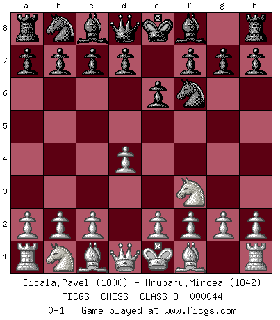 Last move : 0-1 2008 May 16 22:6:16 [Event "FICGS__CHESS__CLASS_B__000044"] [Site "FICGS"] [Date "2008.04.06"] [Round "1"] [White "Cicala,Pavel"] [Black "Hrubaru,Mircea"] [Result "0-1"] [WhiteElo "1800"] [BlackElo "1842"] 1.d4 Nf6 2.Nf3 e6 0-1 This chess game has been lost on time (started : 2008.04.06 1:20:27) Queen's pawn game Player Black won this chess game. Follow this game move after move (download)No price is too great for the scalp of the enemy King. (Koblentz) Gewinnen beim Schach fördert das Selbstvertrauen. Beim Sex spüre ich sowas nicht... (Garry Kasparov) a manera como él juega al Ajedrez, demuestra la completa naturaleza de un hombre. (Stanley Ellin) Les échecs sont plus proches de l'art de l'assassinat que de l'art de la guerre. (Arturo Perez-Reverte) Experiences are the keys to life. (Daniel Parmet)
