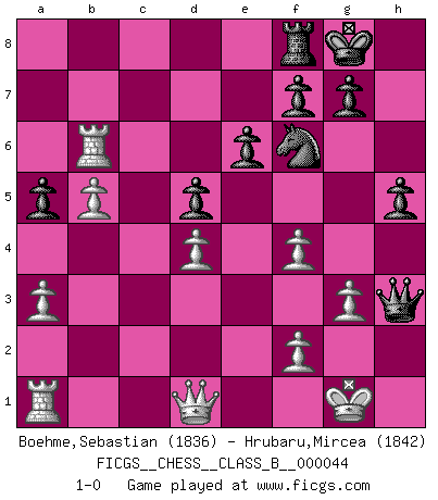 Last move : 1-0 2008 November 27 10:1:22 [Event "FICGS__CHESS__CLASS_B__000044"] [Site "FICGS"] [Date "2008.04.06"] [Round "1"] [White "Boehme,Sebastian"] [Black "Hrubaru,Mircea"] [Result "1-0"] [WhiteElo "1836"] [BlackElo "1842"] 1.d4 Nf6 2.Nf3 e6 3.c4 b6 4.g3 Ba6 5.b3 Bb4+ 6.Bd2 Qe7 7.Bg2 Bb7 8.O-O O-O 9.Bxb4 Qxb4 10.a3 Qa5 11.b4 Qh5 12.h3 Ne4 13.Qd3 a5 14.b5 Ra7 15.Nbd2 Nxd2 16.Qxd2 Bxf3 17.exf3 d6 18.Rfe1 Nd7 19.Re3 R7a8 20.f4 Rac8 21.Bc6 Nb8 22.Bb7 Qxh3 23.Bxc8 Rxc8 24.c5 Nd7 25.cxd6 cxd6 26.Rc3 Rf8 27.Rc6 d5 28.Qd1 h5 29.Rd6 Nf6 30.Rxb6 1-0 This chess game has been lost on time (started : 2008.04.06 1:20:27) Queen's pawn game Kingside Castling by player White (move 8) Kingside Castling by player Black (move 8) Player White won this chess game. Follow this game move after move (download)On the chessboard, lies and hypocrisy do not survive long. (Emanuel Lasker) Mein Name ist Rustam Kamsky. Sie haben meinen Sohn belästigt. Bereiten Sie sich aufs Sterben vor. (Rustam Kamsky) Nunca antes ha habido un jugador de Ajedrez con tal conocimiento a fondo de las complejidades del juego y una inmensa voluntad absolutamente indomable de ganar. Yo pienso que Fischer es el jugador mas grande que jamás haya existido. (Lisa Lane) Toute estimation doit être constamment réévaluée. (Jacob Estrin) CHESS, n. f. [echecs, Fr.] A nice and abstruse game, in which two sets of puppets are moved in opposition to each other. (Dr Samuel Johnson, A Dictionary Of The English Language, 1755)