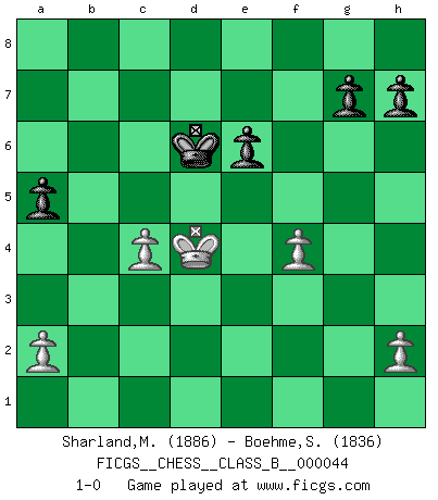 Last move : 1-0 2008 July 3 2:24:13 [Event "FICGS__CHESS__CLASS_B__000044"] [Site "FICGS"] [Date "2008.04.06"] [Round "1"] [White "Sharland,Michael"] [Black "Boehme,Sebastian"] [Result "1-0"] [WhiteElo "1886"] [BlackElo "1836"] 1.e4 c5 2.Nf3 d6 3.d4 cxd4 4.Nxd4 Nf6 5.Nc3 a6 6.Bg5 e6 7.f4 Qb6 8.Qd2 Qxb2 9.Rb1 Qa3 10.f5 Nc6 11.fxe6 fxe6 12.Nxc6 bxc6 13.Be2 Be7 14.O-O O-O 15.Rb3 Qc5+ 16.Be3 Qe5 17.Bf4 Nxe4 18.Nxe4 Qxe4 19.Bxd6 Bxd6 20.Qxd6 Rxf1+ 21.Kxf1 Qd5 22.Qe7 Qd7 23.Rb7 Qxe7 24.Rxe7 Kf8 25.Rc7 a5 26.Kf2 Ba6 27.c4 c5 28.Rxc5 Rc8 29.Rxc8+ Bxc8 30.Ke3 Bb7 31.Bf3 Bxf3 32.gxf3 Ke7 33.f4 Kd6 34.Kd4 1-0 Sicilian : Najdorf, 7...Qb6 Kingside Castling by player White (move 14) Kingside Castling by player Black (move 14) 10 pieces endgame at move 32 : White KPPPP , Black KPPPP WHITE : King + 4 Pawns BLACK : King + 4 Pawns Player White won this chess game. Follow this game move after move (download)What is the difference between chess and football? Everybody understands football, but nobody plays it. Everybody plays chess, but nobody understands it. Everything is relative. (Vladimir Kramnik) Wenn Capablanka heute auf der Schachbühne erscheinen würde, hätte er ein halbes Jahr gebraucht um sich die Schachtheorie anzueignen. Und dann hätte er alles und jeden besiegt. (Mikhail Moiseyevich Botvinik) Hay dos clases de hombres: aquellos que se conforman en dejarse llevar por las circunstancias y que juegan barajas y aquellos decididos a controlar las circunstancias y que juegan al Ajedrez. (Mortimer Collins) Aidez vos pièces, elles vous aideront. (Paul Morphy) There are two kinds of tragedy in this world, one is not getting what you want and the other is getting. (Lord of war)