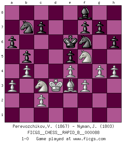 Last move : 1-0 2008 May 19 5:17:52 [Event "FICGS__CHESS__RAPID_B__000088"] [Site "FICGS"] [Date "2008.04.06"] [Round "1"] [White "Perevozchikov,Vjacheslav"] [Black "Nyman,James"] [Result "1-0"] [WhiteElo "1867"] [BlackElo "1803"] 1.e4 d6 2.d4 Nf6 3.Nc3 e5 4.dxe5 dxe5 5.Qxd8+ Kxd8 6.Bc4 Ke8 7.Nf3 Bd6 8.Ng5 Rf8 9.Be3 h6 10.Nf3 Ke7 11.O-O-O Nc6 12.h3 Be6 13.Bxe6 Kxe6 14.a3 a6 15.g4 Rad8 16.Nh4 Rfe8 17.Nf5 Bf8 18.b4 Rxd1+ 19.Rxd1 Rd8 20.Rxd8 Nxd8 21.f3 b6 22.Kd2 Nb7 23.Kd3 b5 24.h4 1-0 Pirc defense Queenside Castling by player White (move 11) Player White won this chess game. Follow this game move after move (download)The enormous mental resilience, without which no Chess player can exist, was so much taken up by Chess that he could never free his mind of this game. (Albert Einstein) Kostenjuk hat keinen Sexappeal. (Loek van Wely) El Ajedrez es realmente noventa y nueve por ciento calculación. (Soltis) On peut tirer plus d'utilité d'une partie perdue que de 100 parties gagnées. (Capablanca) Creativity involves breaking out of established patterns in order to look at things in a different way. (Edward De Bono)