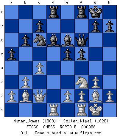 Last move : 0-1 2008 May 17 16:30:10 [Event "FICGS__CHESS__RAPID_B__000088"] [Site "FICGS"] [Date "2008.04.06"] [Round "1"] [White "Nyman,James"] [Black "Colter,Nigel"] [Result "0-1"] [WhiteElo "1803"] [BlackElo "1828"] 1.c4 f5 2.b3 e5 3.Bb2 Nc6 4.g3 Nf6 5.Bg2 d5 6.cxd5 Nxd5 7.d3 Bd6 8.Nd2 Be6 9.Ngf3 O-O 10.Rc1 Qf6 11.O-O Nb6 12.Nc4 Nxc4 13.dxc4 Rad8 14.Qc2 b6 15.Rcd1 a5 0-1 English : Anglo-Dutch defense Kingside Castling by player Black (move 9) Kingside Castling by player White (move 11) Player Black won this chess game. Follow this game move after move (download)You cannot play at Chess if you are kind-hearted. (French Proverb) Darum geht es im Schach. Einen Tag gibst du deinem Gegner eine Lektion, am nächsten Tag gibt er dir eine. (Robert James Fischer) El juego de Fischer siempre fue nítido, racional y brillante. Uno de los mejores por siempre. (Dave Regis) Le moment que je préfère le plus dans une rencontre, c'est celui où je sens que la personnalité de l'adversaire se brise. (Robert Fischer) It's only after you lost everything, Tyler says, that you're free to do anything. (Chuck Palahniuk, Fight Club)