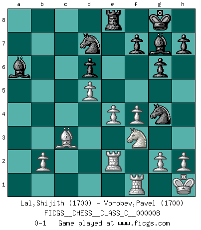 Last move : 0-1 2006 August 13 13:1:17 [Event "FICGS__CHESS__CLASS_C__000008"] [Site "FICGS"] [Date "2006.07.14"] [Round "1"] [White "Lal,Shijith"] [Black "Vorobev,Pavel"] [Result "0-1"] [WhiteElo "1700"] [BlackElo "1700"] 1.d4 Nf6 2.e3 g6 3.f4 Bg7 4.Nf3 O-O 5.Bd3 d6 6.O-O b6 7.c4 Bb7 8.Nc3 c5 9.d5 e6 10.e4 exd5 11.cxd5 a6 12.a4 Nbd7 13.Bd2 Re8 14.Qc2 c4 15.Bxc4 Ng4 16.Rae1 Rc8 17.Bd3 b5 18.axb5 axb5 19.Bxb5 Qb6+ 20.Kh1 Rxc3 21.Bxc3 Qxb5 22.Qe2 Qxe2 23.Rxe2 Ba6 0-1 Queen's pawn game Kingside Castling by player Black (move 4) Kingside Castling by player White (move 6) Player Black won this chess game. Follow this game move after move (download)Morphy was probably the greatest genius of them all. (Bobby Fischer) Wenn ich gewinne bin ich ein Genie. Wenn nicht, dann bin ich keines. (Robert James Fischer) Hoy en día, si tu no eres un Gran Maestro a los 14 años, es mejor que lo olvides. (Anand Viswanathan) La vérité est comme le meilleur coup aux échecs : elle existe, mais il faut la chercher. (Arturo Perez-Reverte) When you've done things right people won't know you've done anything at all. (Futurama)