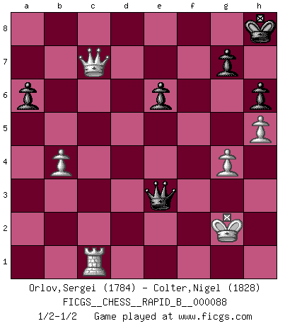 Last move : 1/2-1/2 2008 October 19 19:28:9 [Event "FICGS__CHESS__RAPID_B__000088"] [Site "FICGS"] [Date "2008.04.06"] [Round "1"] [White "Orlov,Vladimir"] [Black "Colter,Nigel"] [Result "1/2-1/2"] [WhiteElo "1784"] [BlackElo "1828"] 1.e4 c6 2.d4 d5 3.Nc3 dxe4 4.Nxe4 Bf5 5.Ng3 Bg6 6.h4 h6 7.Nf3 Nd7 8.h5 Bh7 9.Bd3 Bxd3 10.Qxd3 e6 11.Bf4 Qa5+ 12.Bd2 Bb4 13.c3 Be7 14.O-O Ngf6 15.c4 Qc7 16.Qe2 Bd6 17.Ne4 Nxe4 18.Qxe4 O-O 19.Qe2 Nf6 20.Ne5 c5 21.Bc3 cxd4 22.Bxd4 Rac8 23.b3 Rfd8 24.Rad1 Qa5 25.g3 Bc5 26.Ba1 Qc7 27.Kg2 a6 28.a4 Qb6 29.Qf3 Bf8 30.a5 Qc7 31.Bc3 Nh7 32.Qe2 b5 33.axb6 Qxb6 34.Rxd8 Rxd8 35.Rd1 Rc8 36.Qc2 Nf6 37.f3 Qc7 38.Qb2 Bd6 39.g4 Ne8 40.Nd3 Qb8 41.Qa2 Qb6 42.Ra1 Qe3 43.Qc2 Rd8 44.Re1 Qb6 45.b4 Be7 46.Qf2 Qd6 47.Ne5 Bf6 48.Qe2 Bxe5 49.c5 Qc6 50.Bxe5 Qa4 51.Bc3 Nf6 52.Kg3 Nd5 53.Qe5 Nxc3 54.Qxc3 Qc6 55.Re2 Qd5 56.Rc2 f5 57.Qe3 fxg4 58.fxg4 Kh8 59.Rc3 Qd1 60.Rc1 Qd5 61.c6 Rc8 62.Qc3 Qe4 63.c7 Rxc7 64.Qxc7 Qe3+ 65.Kg2 1/2-1/2 Caro-Kann : Classical, 7...Nd7 Kingside Castling by player White (move 14) Kingside Castling by player Black (move 18) This chess game ended in a draw. Follow this game move after move (download)For me, Chess is life and every game is like a new life. Every Chess player gets to live many lives in one lifetime. (Eduard Gufeld) Das Schachspiel ist ein See, in welchem eine Mücke baden und ein Elefant ertrinken kann. (Emanuel Lasker) Bobby Fischer es el jugador de Ajedrez mas grande que jamás haya existido. (Ken Smith) Horreur, mais aussi harmonie suprême : qu'y avait-il en effet au monde en dehors des échecs ? Le brouillard, l'inconnu, le non-être... (Vladimir Nabokov) Perception is reality. (Immanuel Kant)