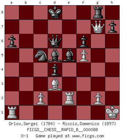 Last move : 0-1 2008 May 11 8:31:20 [Event "FICGS__CHESS__RAPID_B__000088"] [Site "FICGS"] [Date "2008.04.06"] [Round "1"] [White "Orlov,Vladimir"] [Black "Riccio,Domenico"] [Result "0-1"] [WhiteElo "1784"] [BlackElo "1897"] 1.e4 c5 2.Nf3 d6 3.d4 cxd4 4.Nxd4 Nf6 5.Nc3 a6 6.Bg5 e6 7.f4 Qb6 8.Qd2 Qxb2 9.Rb1 Qa3 10.f5 e5 11.Bxf6 gxf6 12.Nd5 exd4 13.Nc7+ Kd8 14.Nxa8 Qxa2 15.Rd1 Nd7 16.Be2 d5 17.O-O Bc5 18.Bd3 Qa3 19.Ra1 Qb4 20.Qf4 Bd6 21.Qh6 Be5 22.Rfb1 Qd6 23.Qg7 Re8 24.Re1 Bxh2+ 25.Kh1 Bg3 26.Re2 b5 27.Qxf7 Bb7 28.exd5 Be5 29.Qh5 Nc5 30.Qf7 Bxa8 31.Bxb5 Rf8 32.Qg7 Bxd5 33.Bd3 Rg8 0-1 Sicilian : Najdorf, 7...Qb6 Kingside Castling by player White (move 17) Player Black won this chess game. Follow this game move after move (download)What is the object of playing a gambit opening?... To acquire a reputation of being a dashing player at the cost of losing a game. (Siegbert Tarrasch) Über die Verhaftung Bobby Fischers: Warum es die Bush-Administration für nötig befindet einen 61 Jahre alten Mann zu hetzten, der für niemanden ausser sich selbste eine Gefahr darstellt ist ein Rätsel. (Nigel Short) Cuando tengo las piezas blancas, yo gano porque soy blanco; Cuando tengo las piezas negras, yo gano porque soy Bogolyubov. (Bogolyubov) Tout change constamment, y compris dans le monde des Echecs. (Botvinnik) There is no instance of a country having benefited from prolonged warfare. (Sun Tzu)