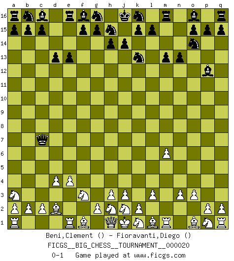 Last move : 0-1 2008 May 26 10:46:35 [Event "FICGS__BIG_CHESS__TOURNAMENT__000020"] [Site "FICGS"] [Date "2008.04.06"] [Round "1"] [White "Beni,Clement"] [Black "Fioravanti,Diego"] [Result "0-1"] [WhiteElo ""] [BlackElo ""] 1.e2-e4 j15-k13 2.d2-d4 n15-n13 3.m2-m4 h16-o10 4.o2-o3 o10-f2 5.g1-f3 f2-l7 6.l2-l3 d15-d13 7.n2-n3 m15-m13 8.m4-m5 l16-p12 9.c1-d2 e15-e13 10.m5-m6 l7-c7 11.b1-a3 p16-o14 0-1 This big chess game has been lost on time (started : 2008.04.06 9:10:37) Follow this game move after move (download)He who fears an isolated Queen's Pawn should give up Chess. (Siegbert Tarrasch) Das Zentrum ist der Balkan des Schachbretts - Kriegshandlungen können in jedem Moment ausbrechen. (Aaron Nimzowitsch) No hay precio que sea tan grande por la cabellera del Rey enemigo. (Koblentz) Il s'avisa de me proposer d'apprendre les échecs qu'il jouait un peu... me voilà forcené des échecs. J'achète un échiquier, je m'enferme dans ma chambre, j'y passe des jours et des nuits à vouloir apprendre par cur toutes les parties. (Jean-Jacques Rousseau, Confessions) Be who you are, and say what you feel because those who mind don't matter, and those who matter don't mind. (Dr Seuss)