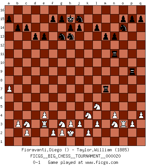 Last move : 0-1 2008 September 11 18:24:13 [Event "FICGS__BIG_CHESS__TOURNAMENT__000020"] [Site "FICGS"] [Date "2008.04.06"] [Round "1"] [White "Fioravanti,Diego"] [Black "Taylor,William"] [Result "0-1"] [WhiteElo ""] [BlackElo "1885"] 1.e2-e4 j15-h13 2.j2-g3 h16-o10 3.p1-q3 d15-d13 4.h1-l4 k16-l14 5.d2-d4 e15-e13 6.m2-m4 n15-n13 7.b1-c3 m15-m13 8.f1-b5 f16-b12 9.l1-m2 b12-m2 10.k1-m2 b15-b14 11.n2-n4 c16-a14 12.l4-l6 c15-c14 13.c1-g5 o16-g9 14.o1-a14 b16-a14 15.b5-l14 k15-l14 16.l6-l14 j16-k16 17.l14-f9 g9-m4 18.f9-a14 l16-o13 19.a14-k5 k16-j16 20.m2-o3 m4-d12 21.m1-m2 p16-o14 22.q1-m1 g16-j15 23.g1-j2 m16-k16 24.k5-n5 q16-n16 25.h2-j4 h15-g13 26.j2-k4 j16-h15 27.j1-h2 k16-k9 28.g5-p13 l15-l14 29.n5-n11 o10-n11 30.p13-n11 e16-k16 31.a2-a4 k16-k11 32.n11-h6 a16-k16 33.l2-l3 k16-k13 34.q3-o4 n16-k16 35.o4-m5 k11-o11 36.a4-a5 k9-p9 37.p2-p3 o11-o3 38.a5-a6 o3-o2 39.m2-o2 d12-o2 40.m1-o1 o2-h8 41.o1-o13 h8-d4 42.h6-e3 d4-e3 43.e1-e3 p9-q9 44.q2-q4 q9-p9 45.o13-o3 k13-k11 46.m5-n3 k11-n11 47.j4-l5 k16-k10 48.a1-m1 k10-b10 49.b2-b3 b10-b6 50.a6-a7 b6-b7 51.m1-m7 b7-m7 0-1 Follow this game move after move (download)If a ruler does not understand Chess, how can he rule over a kingdom ? (King Khusros II) Stelle das Brett so, daß die Sonne in die Augen deines Gegners scheint. (Ruy López) Nunca antes ha habido un jugador de Ajedrez con tal conocimiento a fondo de las complejidades del juego y una inmensa voluntad absolutamente indomable de ganar. Yo pienso que Fischer es el jugador mas grande que jamás haya existido. (Lisa Lane) Les échecs c'est le défi de l'alpiniste, toujours plus haut, prêt à tout pour monter à l'assaut du Roi ennemi. Les échecs, c'est de la musique en mouvement, un ballet majestueux pour les yeux. C'est de la poésie composée par les fantômes du passé qui au même titre que Rimbaud ou Verlaine méritent notre admiration. Les échecs, c'est de la peinture ou le moindre mouvement modifie le tableau pour en faire un Picasso ou un Van Gogh. Les échecs, c'est tout et rien, c'est la vie et la mort. Jjulie33 sur le forum de France-Echecs. Home computers are being called upon to perform many new functions, including the consumption of homework formerly eaten by the dog. (Doug Larson)