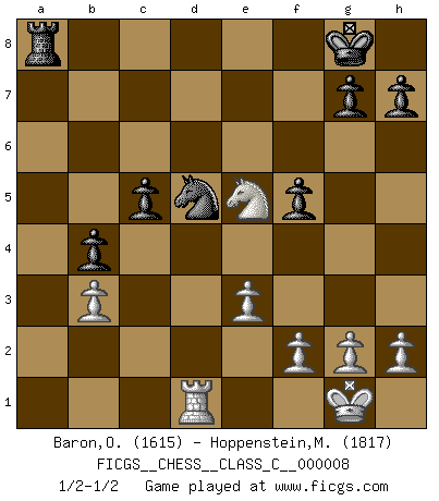 Last move : 1/2-1/2 2006 September 10 20:50:35 [Event "FICGS__CHESS__CLASS_C__000008"] [Site "FICGS"] [Date "2006.07.14"] [Round "1"] [White "Baron,Ovidiu"] [Black "Hoppenstein,Michael"] [Result "1/2-1/2"] [WhiteElo "1615"] [BlackElo "1817"] 1.d4 d5 2.c4 e5 3.e3 Nc6 4.cxd5 Qxd5 5.Nc3 Bb4 6.Bd2 Bxc3 7.bxc3 Nf6 8.c4 Qd6 9.d5 Ne7 10.Rb1 Ne4 11.Bb4 c5 12.Bd3 cxb4 13.Bxe4 O-O 14.Qd2 a5 15.Nf3 f5 16.Bc2 b6 17.O-O Ba6 18.Bb3 Rfc8 19.Rfc1 Rc5 20.Qb2 a4 21.Bxa4 Bxc4 22.Nxe5 Bxd5 23.Bb3 Bxb3 24.Qxb3+ Qd5 25.Rxc5 bxc5 26.Rd1 Qxb3 27.axb3 Nd5 1/2-1/2 QGD : Albin counter-gambit Kingside Castling by player Black (move 13) Kingside Castling by player White (move 17) This chess game ended in a draw. Follow this game move after move (download)There are tough players and nice guys, and I'm a tough player. (Bobby Fischer) Kann Schach nicht schließlich das Nationalspiel der Deutschen werden? Und welche weiteren Ausblicke bieten sich dann dar! Welche Hebung des allgemeinen Kultur-Niveaus, ja der Moral, wenn das Schachbrett den Kartentisch verdrängen würde! Wahrlich, ein Ziel, des Schweißes der Edlen wert! (Siegbert Tarrasch) Alekhine es un poeta que crea un trabajo de arte de algo que raramente inspiraría a otra persona a mandar una tarjeta postal. (Max Euwe) A chaque perte on perd un peu de soi. (Joël Lautier) A computer lets you make more mistakes faster than any invention in human history - with the possible exceptions of handguns and tequila. (Mitch Ratcliffe)