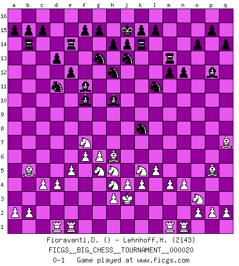 Last move : 0-1 2008 September 12 16:5:45 [Event "FICGS__BIG_CHESS__TOURNAMENT__000020"] [Site "FICGS"] [Date "2008.04.06"] [Round "1"] [White "Fioravanti,Diego"] [Black "Lehnhoff,Heinz-Georg"] [Result "0-1"] [WhiteElo ""] [BlackElo "2143"] 1.j2-k4 h15-g13 2.d2-d4 j15-k13 3.p1-o3 e15-e13 4.n2-n4 d15-d13 5.h1-m5 e13-e12 6.e2-e4 m15-m13 7.o1-j6 b16-a14 8.m2-m4 h16-p9 9.l1-p5 k16-h15 10.b1-c3 f16-b12 11.g1-j2 c16-g12 12.f1-b5 g16-j15 13.k1-l3 n15-n13 14.c1-g5 g12-f11 15.m5-l5 p9-j9 16.a1-d1 b12-c13 17.l5-l9 j9-l9 18.g5-l9 o16-g9 19.q1-n1 l16-o13 20.f2-f4 p16-n15 21.f4-f5 a14-b12 22.j2-h4 b12-d11 23.j1-j2 m13-m12 24.e4-e5 n15-m13 25.g2-g4 m13-l11 26.c3-e4 e16-e14 27.g4-g5 e14-b14 28.c2-c4 a16-e16 29.h2-j4 l11-j10 30.l9-h6 k13-l11 31.g5-g6 j15-k13 32.e4-g5 j16-j15 33.l3-k5 m16-m14 34.l2-l4 o15-o14 35.g5-f7 g9-h10 36.k4-h5 q15-q14 37.k2-k4 k13-h12 38.j2-k3 h15-j13 39.j4-g5 e16-e14 40.j3-j4 m14-k14 41.k3-j3 c13-f10 42.l4-l5 q16-m16 43.j6-h7 o13-p12 44.f5-f6 j10-k8 45.h7-m11 n13-n12 46.m11-q7 m16-m13 0-1 Follow this game move after move (download)Fischer wanted to give the Russians a taste of their own medicine. (Larry Evans) Im Schach gewinnt jeder. Hat man Freunde am Spiel - und das ist die Hauptsache - ist auch der Verlust einer Partie kein Unglück. (David Bronstein) El Ajedrez demanda una total concentración. (Bobby Fischer) Les échecs, c'est la lutte contre l'erreur. (Johannes Zukertort) If you are good, you will be assigned all the work. If you are really good, you will get out of it. (Dan Rotaru)
