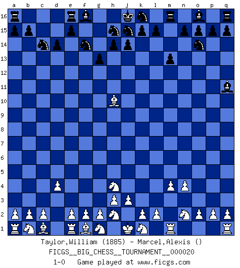 Last move : 1-0 2008 May 3 8:15:33 [Event "FICGS__BIG_CHESS__TOURNAMENT__000020"] [Site "FICGS"] [Date "2008.04.06"] [Round "1"] [White "Taylor,William"] [Black "Marcel,Alexis"] [Result "1-0"] [WhiteElo "1885"] [BlackElo ""] 1.j2-h4 g15-g13 2.h1-o7 p16-o14 3.o7-f15 e16-d16 4.f15-f7 m15-m13 5.m2-m4 h16-f14 6.f7-f14 g16-f14 7.l1-o4 l16-q11 8.o4-c15 d16-e16 9.c15-h10 b16-c14 10.d2-d4 d15-d14 11.n2-n4 c16-p4 12.o1-n2 p4-n2 13.p1-n2 1-0 Follow this game move after move (download)Chess problems demand from the composer the same virtues that characterize all worthwhile art: originality, invention, conciseness, harmony, complexity, and splendid insincerity. (Vladimir Nabokov) Das Schachspiel hat wie die Liebe, die Musik, die Fähigkeit, den Menschen glücklich zu machen. Ich habe ein leises Gefühl des Bedauerns für jeden, der das Schachspiel nicht kennt, so wie ich jeden bedaure, der die Liebe nicht kennt. (Siegbert Tarrasch) Si un gobernante no entiende al Ajedrez, ¿como puede governar él un reinado?. (El Rey Khusros II) Les Cavaliers se révèlent fort utiles dans les positions fermées. D'habitude, les Fous sont un peu plus forts que les Cavaliers dans les positions ouvertes. Qu'on le veuille ou non, il restera toujours des exceptions ! A good book on your shelf is a friend that turns its back on you and remains a friend. (Author unknown)