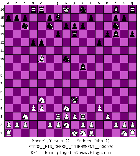 Last move : 0-1 2008 May 3 8:18:3 [Event "FICGS__BIG_CHESS__TOURNAMENT__000020"] [Site "FICGS"] [Date "2008.04.06"] [Round "1"] [White "Marcel,Alexis"] [Black "Madsen,John"] [Result "0-1"] [WhiteElo ""] [BlackElo ""] 1.j2-h4 m15-m13 2.h1-o7 j15-h13 3.e2-e4 p16-o14 4.f1-c4 g15-g13 5.c4-a6 g16-f14 6.h4-g6 m16-m14 7.d2-d4 q15-q13 8.n2-n3 h16-m12 9.g1-f3 h15-j13 10.o1-e10 j13-g12 11.o7-o5 d15-d13 12.e10-d11 j16-h16 13.o5-n5 e15-e13 14.c1-n11 m12-n11 15.n5-n11 m13-m12 16.n11-p13 m14-m13 17.p13-f4 e13-e12 18.d11-e10 h13-f12 19.f4-h6 n15-n13 20.e1-e3 l16-o13 21.f3-e5 f16-g15 22.e3-g3 f12-e10 23.a6-e10 g12-h10 24.b1-c3 b16-c14 25.g6-h4 c16-k9 26.m2-m4 d13-d12 27.m1-m3 a16-d16 28.m3-k3 k15-k14 29.h6-j5 m13-j13 0-1 Follow this game move after move (download)Why must I lose to this idiot ? (Aron Nimzovich) Der Freibauer hat für mich eine Seele, genau wie der Mensch, Wünsche, die unerkannt in ihm schlummern, und Befürchtungen, von deren Existenz er selbst kaum ahnt. (Aaron Nimzowitsch) No puedes jugar al Ajedrez si eres de corazón noble. (Proverbio Francés) Il (Jacob Murray) ne joue pas pour le bon coup, mais pour le meilleur. (Eloi Relange) No, I am still playing. (Anatoly Karpov)