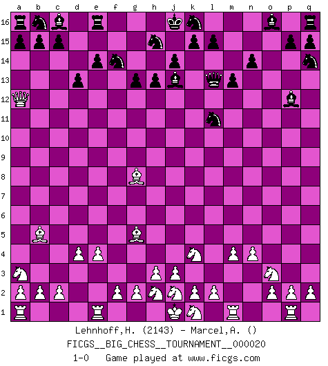 Last move : 1-0 2008 May 3 17:57:19 [Event "FICGS__BIG_CHESS__TOURNAMENT__000020"] [Site "FICGS"] [Date "2008.04.06"] [Round "1"] [White "Lehnhoff,Heinz-Georg"] [Black "Marcel,Alexis"] [Result "1-0"] [WhiteElo "2143"] [BlackElo ""] 1.j2-k4 j15-k13 2.h1-o7 h14-h13 3.o7-o15 p16-q14 4.o15-f7 g16-f14 5.m2-m4 m15-m13 6.e2-e4 l16-n14 7.d2-d4 m16-m14 8.f7-f6 h16-m12 9.c1-g5 m14-l14 10.l1-o4 d15-d14 11.o4-j9 k13-l11 12.f1-b5 l14-l12 13.n2-n4 g15-g13 14.p1-o3 f14-g12 15.f6-f15 g12-f14 16.f15-a10 e15-e14 17.b1-a3 m12-m9 18.j9-f6 d14-d13 19.o1-j6 m9-p9 20.q1-p1 n14-p12 21.j6-g8 l12-l13 22.g1-j2 f16-j13 23.f6-e7 n15-n14 24.e7-l13 p9-l13 25.a10-a12 1-0 Follow this game move after move (download)Chess is so inspiring that I do not believe a good player is capable of having an evil thought during the game. (Wilhelm Steinitz) Matt entspricht nicht immer den Tatsachen. (Savielly Grigorievitsch Tartakower) La maestría del Ajedrez consiste esencialmente en analizar posiciónes de Ajedrez con precisión. (Mikhail Botvinnik) Botvinnik disait en comparant les échecs à la musique: Il existe une science dont le but est l'étude de l'acoustique et des sons. Mais il y a aussi un art qui se sert de l'océan des sons : c'est la musique. De toute évidence, il en est de même pour la pensée. La logique est l'étude des lois de la réflexion et les échecs reflètent, en tant qu'art, le côté logique de la réflexion, sous la forme d'images artistiques... Extrait de Fischer - Spassky, Reykjavik 1972 par Alexander & F. Wyndham (Ed. Solar), p 37. There are three kinds of lies: lies, damned lies and statistics. (Mark Twain)
