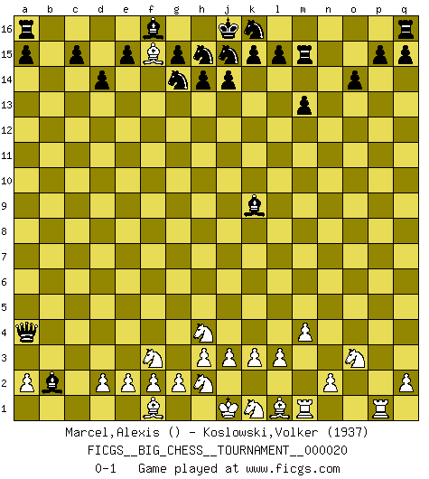 Last move : 0-1 2008 May 3 10:30:45 [Event "FICGS__BIG_CHESS__TOURNAMENT__000020"] [Site "FICGS"] [Date "2008.04.06"] [Round "1"] [White "Marcel,Alexis"] [Black "Koslowski,Volker"] [Result "0-1"] [WhiteElo ""] [BlackElo "1937"] 1.j2-h4 j15-g14 2.h1-o7 m15-m13 3.o7-o15 p16-o14 4.b2-b4 h16-k14 5.c1-b2 l16-n14 6.b2-m12 k14-l14 7.o15-n14 l14-n14 8.p2-p4 d15-d14 9.p4-p5 n14-n12 10.m12-o14 n15-o14 11.o1-p2 n12-c2 12.g1-f3 c2-c10 13.k2-k3 o16-b4 14.b1-c3 c10-c5 15.c3-a4 c5-p5 16.p2-o3 p5-l5 17.l2-l3 l5-o2 18.a1-b1 o2-g9 19.m2-m4 b16-c14 20.e1-c1 c16-k9 21.b1-b2 b4-a3 22.c1-c14 b15-c14 23.o3-c14 a3-b2 24.c14-e16 g9-g10 25.p1-o3 g10-a4 26.e16-f15 g16-j15 27.q1-p1 m16-m15 0-1 Follow this game move after move (download)If one piece is badly posted, the whole game is bad. (Tarrasch) Kostenjuk hat keinen Sexappeal. (Loek van Wely) Hasta este punto, las blancas han seguido un análisis bien conocido. Pero ahora el hace un error fatal: empieza a usar su propia cabeza. (Siegbert Tarrasch) Les échecs sont plus proches de l'art de l'assassinat que de l'art de la guerre. (Arturo Perez-Reverte) If you know the enemy and know yourself you need not fear the results of a hundred battles. (Sun Tzu)