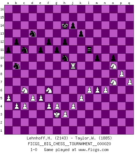 Last move : 1-0 2009 February 9 20:29:29 [Event "FICGS__BIG_CHESS__TOURNAMENT__000020"] [Site "FICGS"] [Date "2008.04.06"] [Round "1"] [White "Lehnhoff,Heinz-Georg"] [Black "Taylor,William"] [Result "1-0"] [WhiteElo "2143"] [BlackElo "1885"] 1.j2-k4 j15-h13 2.h1-o7 p16-o14 3.o7-l7 k16-l14 4.l7-c15 h16-o10 5.h2-g4 o10-o2 6.m2-m4 o2-o13 7.b1-c3 b16-c14 8.c15-j9 d15-d13 9.n2-n4 o13-k9 10.j9-f6 g16-f14 11.e2-e4 e15-e13 12.d2-d4 f16-c13 13.p1-o3 m15-m13 14.f1-d3 k9-k6 15.o1-j6 c16-k9 16.k1-l3 n15-n13 17.l3-j4 k6-h8 18.f6-b6 b15-b14 19.c1-g5 o16-g9 20.l2-l3 g9-f10 21.b6-b9 l16-o13 22.g1-f3 j16-j15 23.a1-d1 g15-g14 24.l1-o4 f10-g11 25.o4-p5 f14-e12 26.j4-l5 f15-f13 27.l5-k7 h8-g9 28.b9-a10 e12-c11 29.a10-o10 h15-k14 30.c3-d5 a16-c16 31.a2-a3 q16-n16 32.g5-e7 g9-f10 33.o10-j5 d13-d12 34.k7-m8 k9-h7 35.f3-g5 h7-j6 36.g5-j6 g11-h10 37.j5-g7 h10-e7 38.g7-e7 e13-e12 39.e4-e5 o13-d3 40.d1-d3 f10-a5 41.d5-b4 c13-a11 42.e7-p7 n16-p16 43.j1-h2 c14-e13 44.c2-c3 c11-d13 45.d3-f3 a5-d8 46.f3-f7 a11-e15 47.m8-n6 e15-p5 48.o3-p5 c16-c8 49.f7-d7 d8-b10 50.q1-o1 c8-d8 51.p7-e7 d8-d10 52.e7-b10 d10-b10 53.d7-d12 h13-f14 54.o1-o7 e16-c16 55.e1-e4 e13-f11 56.d12-d6 c16-c13 57.m1-o1 m16-c16 58.o7-p7 c13-c10 59.o1-o7 c10-o10 60.d6-d7 c16-c10 61.g4-f6 o14-n12 62.e4-g4 g14-g13 63.d7-a7 a15-a13 64.g4-g8 p15-p14 65.g8-q8 q15-q13 66.q8-q13 o10-o7 67.a7-o7 c10-o10 68.q13-q8 p16-c16 69.q2-q4 c16-c9 70.p2-p3 l14-m12 71.q8-q15 c9-o9 72.q15-q7 p14-p13 73.f2-f4 o15-o13 74.g2-g4 l15-l14 75.n6-o4 p13-p12 76.o7-c7 o10-c10 77.q7-q15 o9-o10 78.c7-c10 b10-c10 79.p7-q7 c10-c16 80.h2-g3 k14-l12 81.q7-k7 m12-k13 82.k7-o7 o10-o7 83.p5-o7 o13-o12 84.n4-n5 c16-c7 85.q15-q7 n12-m10 86.o7-p5 c7-c8 87.o4-m5 c8-o8 88.q7-o7 o8-b8 89.m5-o6 b14-b13 90.o7-c7 b13-b12 91.p3-p4 b8-q8 92.q4-q5 a13-a12 93.p5-n4 a12-a11 94.p4-p5 p12-p11 95.p5-p6 o12-o11 96.n4-p5 n13-n12 97.p5-o7 q8-q9 98.c7-c8 d13-c11 99.c8-d8 f14-d13 100.q5-q6 k13-h12 101.q6-q7 p11-p10 102.b4-c6 f13-f12 103.b2-b4 e12-e11 104.c3-c4 f11-d10 105.d4-d5 h14-h13 106.a3-a4 g13-g12 107.a4-a5 n12-n11 108.j6-l7 m13-m12 109.l7-n8 l14-l13 110.n8-m10 l12-m10 111.p6-p7 o11-o10 112.p7-p8 q9-k9 113.n5-n6 k15-k13 114.m4-m5 k9-l9 115.k4-l6 l13-l12 116.k2-k4 j15-h14 117.l3-l4 d10-b9 118.d8-j8 h12-k11 119.j3-j4 k11-h10 120.j8-j10 m10-k11 121.o6-m7 l9-k9 122.k4-k5 g12-g11 123.l4-l5 m12-m11 124.m5-m6 k11-j9 125.l6-m8 k9-m9 126.m7-o8 m9-l9 127.o8-p10 l12-l11 128.p10-n11 h13-h12 129.l5-l6 m11-m10 130.m8-n10 l9-k9 131.n10-l11 k9-k11 132.j10-j9 k11-l11 133.n11-o9 1-0 Follow this game move after move (download)I prefer to lose a really good game than to win a bad one. (David Levy) Die Partien sind immer verschieden, die Interviews immer die gleichen. (Garry Kasparov) Me siento como si fuera una pieza en una partida de Ajedrez, cuando mi oponente me indica: esa pieza no puede ser movida. (Soren Kierkegaard) Si je n'étais pas joueur d'échecs, je serais le meilleur dans quelque chose d'autre. (Anatoli Karpov) Internet: Absolute communication, absolute isolation. (Paul Carvel)