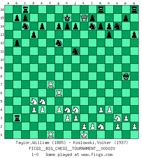 Last move : 1-0 2008 August 14 10:37:6 [Event "FICGS__BIG_CHESS__TOURNAMENT__000020"] [Site "FICGS"] [Date "2008.04.06"] [Round "1"] [White "Taylor,William"] [Black "Koslowski,Volker"] [Result "1-0"] [WhiteElo "1885"] [BlackElo "1937"] 1.j2-h4 g15-g14 2.g2-g4 h16-d12 3.h1-o7 p16-o14 4.m2-m3 n15-n13 5.l1-n3 o16-g9 6.n3-g9 d12-g9 7.p2-p3 g9-d9 8.o7-k3 d9-f11 9.p1-o3 f11-f2 10.g1-f3 f2-c5 11.b1-c3 c5-f8 12.o1-q3 m15-m14 13.e2-e4 b16-c14 14.d2-d4 k16-l14 15.f1-c4 l16-n14 16.c4-n14 o15-n14 17.h2-j4 d15-d13 18.q3-c16 a16-c16 19.c1-h6 f8-b8 20.k1-h2 b8-b2 21.h6-d2 b2-c2 22.e1-c1 c2-d3 23.j1-j2 e15-e14 24.a1-b1 f16-b12 25.b1-b6 d3-c4 26.c3-d5 c4-a4 27.c1-c6 a4-a8 28.m1-b1 g16-f14 29.q1-c1 a8-n8 30.n2-n4 a15-a13 31.d2-h6 n8-o9 32.m3-m4 f14-g12 33.h2-k1 j15-h13 34.k1-m2 q15-q13 35.h6-b12 a13-b12 36.k3-n6 o9-o12 37.c6-g6 h13-j11 38.b6-f6 c16-a16 39.f6-f15 a16-a2 40.j2-k1 e16-c16 41.n6-k6 o12-o7 42.c1-c7 o7-p8 43.c7-f7 a2-b2 44.b1-f1 b2-b9 45.f3-e5 b9-b3 46.f15-h15 j16-h15 47.k6-k15 1-0 Follow this game move after move (download)I'd rather have a Pawn than a finger. (Reuben Fine) Wenn Spassky eine Figur opfert kannst du genauso gut aufgeben. Aber wenn Tal eine Figur opfert, spiel weiter. Er könnte noch eine weitere opfern, und dann ... wer weiß? (Miguel Najdorf) Yo tuve un dolor de muelas en la primer partida. En el segundo juego, tuve un dolor de cabeza. En el tercero, tuve un ataque de reumatísmo. En la cuarta partida, no me sentía muy bien. ¿Y en el quinto juego? Bueno, ¿que acaso uno tiene que ganar todos los juegos?. (Siegbert Tarrasch) J'apprécie les joueurs d'est-indienne, c'est grâce à eux que je nourris ma famille depuis tant d'années. (Petrosian) The ego is not master in its own house. (Sigmund Freud)