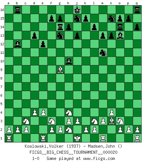 Last move : 1-0 2008 August 1 4:52:5 [Event "FICGS__BIG_CHESS__TOURNAMENT__000020"] [Site "FICGS"] [Date "2008.04.06"] [Round "1"] [White "Koslowski,Volker"] [Black "Madsen,John"] [Result "1-0"] [WhiteElo "1937"] [BlackElo ""] 1.j2-h4 m15-m13 2.h1-l4 l15-l14 3.l4-c12 h15-g13 4.c12-c15 b16-c14 5.c15-g11 m16-m14 6.d2-d4 j15-h13 7.g11-d11 h16-h15 8.n2-n4 e15-e13 9.c1-o12 m14-o14 10.d11-p11 k16-m15 11.o1-d11 e13-e12 12.d11-j6 o14-p14 13.o12-p13 q15-q14 14.p11-l15 h13-j15 15.p13-j7 j14-j13 16.l15-o12 p14-o14 17.o12-k8 e16-e14 18.p1-o3 n15-n13 19.k8-k9 d15-d13 20.k9-j8 m15-l13 21.b1-c3 h15-m11 22.j8-m11 l13-m11 23.j6-n10 l16-o13 24.k1-l3 o16-h10 25.n10-l8 e14-f14 26.l8-c16 a16-c16 27.g1-f3 p16-n15 28.m2-m3 f16-b12 29.e2-e4 g16-e15 30.f1-c4 c14-d12 31.c4-j10 c16-c10 32.j7-d12 f14-g14 33.d12-a15 b15-b14 34.l1-n3 e15-c16 35.j10-c16 c10-c16 36.a15-b14 c16-b16 37.b14-g9 1-0 This big chess game has been lost on time (started : 2008.04.06 9:10:37) Follow this game move after move (download)Before the endgame, the Gods have placed the middle game. (Siegbert Tarrasch) Die starken Figuren des Gegners muss man abtauschen. (José Raúl Capablanca) El Ajedrez lo es todo: arte, ciencia y deporte. (Anatoly Karpov) La tactique est l'élément le plus important du milieu de jeu. (Siegbert Tarrasch) Faith : not wanting to know what is true. (Friedrich Nietzsche)