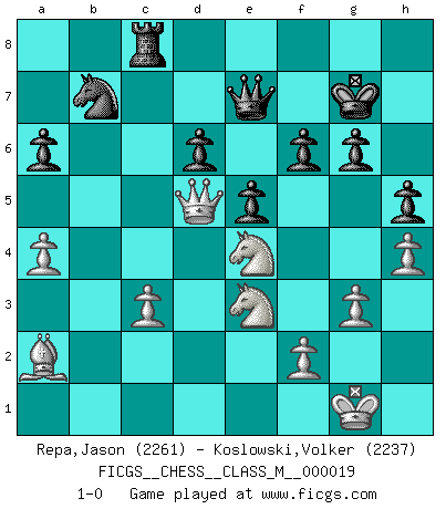 Last move : 1-0 2008 November 28 7:55:32 [Event "FICGS__CHESS__CLASS_M__000019"] [Site "FICGS"] [Date "2008.04.08"] [Round "1"] [White "Repa,Jason"] [Black "Koslowski,Volker"] [Result "1-0"] [WhiteElo "2261"] [BlackElo "2237"] 1.e4 e5 2.Nf3 Nc6 3.Bb5 a6 4.Ba4 Nf6 5.O-O Be7 6.Re1 b5 7.Bb3 O-O 8.a4 Bb7 9.d3 d6 10.Nbd2 Na5 11.Ba2 c5 12.Nf1 b4 13.c3 bxc3 14.bxc3 Bc6 15.Bg5 Ng4 16.Bxe7 Qxe7 17.h3 Nf6 18.Qd2 Rab8 19.Ne3 Qd8 20.Nf5 c4 21.Rab1 Rxb1 22.Rxb1 Nxe4 23.dxe4 Bxe4 24.Ne3 Bxb1 25.Bxb1 g6 26.Bc2 f6 27.Qd5+ Kh8 28.h4 Kg7 29.g3 h5 30.Nd2 Qc7 31.Ne4 Nb7 32.Nxc4 Rb8 33.Bb3 Qe7 34.Ba2 Rc8 35.Ne3 1-0 Ruy Lopez : Closed, 7...O-O Kingside Castling by player White (move 5) Kingside Castling by player Black (move 7) Player White won this chess game. Follow this game move after move (download)When I have White, I win because I am white; When I have Black, I win because I am Bogolyubov. (Bogolyubov) Die Fehler sind da, Sie warten nur darauf gemacht zu werden. (Savielly Grigorievitsch Tartakower) Cuando estes solo, cuando te sientas un extraño en el mundo, juega al Ajedrez. Esto levantará tu espiritu y será tu consejero de guerra. (Aristóteles) Un journaliste : 'Vous préférez avoir une dame de plus sur l'échiquier ou au lit ?' Boris Spassky : 'Ca dépend de la position.' The production of too many useful things results in too many useless people. (Karl Marx)