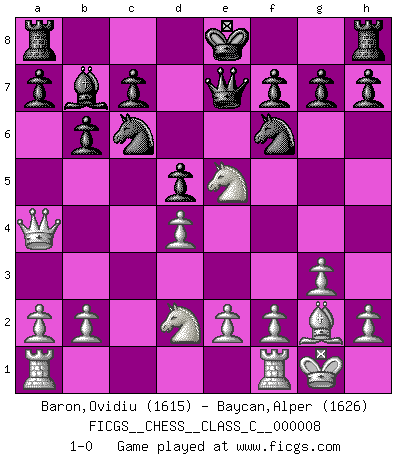 Last move : 1-0 2006 July 30 21:41:11 [Event "FICGS__CHESS__CLASS_C__000008"] [Site "FICGS"] [Date "2006.07.14"] [Round "1"] [White "Baron,Ovidiu"] [Black "Baycan,Alper"] [Result "1-0"] [WhiteElo "1615"] [BlackElo "1626"] 1.d4 Nf6 2.c4 e6 3.Nf3 b6 4.g3 Bb7 5.Bg2 Bb4+ 6.Bd2 Qe7 7.O-O d5 8.Qa4+ Nc6 9.cxd5 exd5 10.Ne5 Bxd2 11.Nxd2 1-0 Queen's Indian : Capablanca variation Kingside Castling by player White (move 7) Player White won this chess game. Follow this game move after move (download)Daring ideas are like Chess men moved forward. They may be beaten, but they may start a winning game. (Johann Wolfgang von Goethe) Die Auseinandersetzung mit Karpow war politisch geprägt. Er stand für das kommunistische System, wurde von dessen Repräsentanten gehätschelt. Ich war der Oppositionelle. Jeder Schachweltmeister spiegelt auch die gesellschaftlichen Verhältnisse wider. Kramnik steht für die Börsen-Generation des Neuen Markts, ideologiefrei, zahlenfixiert. (Garry Kasparov) No puedes jugar al Ajedrez si eres de corazón noble. (Proverbio Francés) Soyez une menace à chaque fois que vous vous asseyez pour jouer. (Ken Smith) As the days dwindle down... to a precious few. (Maxwell Anderson)