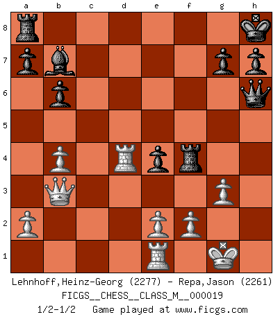 Last move : 1/2-1/2 2008 December 26 0:35:40 [Event "FICGS__CHESS__CLASS_M__000019"] [Site "FICGS"] [Date "2008.04.08"] [Round "1"] [White "Lehnhoff,Heinz-Georg"] [Black "Repa,Jason"] [Result "1/2-1/2"] [WhiteElo "2277"] [BlackElo "2261"] 1.d4 Nf6 2.c4 e6 3.Nf3 b6 4.g3 Bb7 5.Bg2 Be7 6.Nc3 Ne4 7.Bd2 O-O 8.O-O f5 9.Qc2 Bf6 10.Rad1 Nxc3 11.Bxc3 Be4 12.Qc1 d6 13.Rfe1 Nd7 14.Bf1 Bb7 15.d5 Nc5 16.Nd4 exd5 17.Bg2 Bxd4 18.Bxd4 c6 19.b4 Ne4 20.cxd5 cxd5 21.Qa3 f4 22.Bxe4 dxe4 23.Be5 Qg5 24.Bxd6 fxg3 25.hxg3 Rf5 26.Rd4 Qh6 27.Qb3+ Kh8 28.Bf4 Rxf4 1/2-1/2 Queen's Indian : Opovcensky variation Kingside Castling by player Black (move 7) Kingside Castling by player White (move 8) This chess game ended in a draw. Follow this game move after move (download)It is difficult to play against Einstein's theory --on his first loss to Fischer. (Mikhail Tal) Offensichtlich kennt Kasparow nichts anderes als Schach, und ich könnte 500 weitere Spieler dieser Sorte benennen. (Judith Polgar) El Ajedrez detiene a su maestro dentro de sus propios vínculos, encadenando la mente y el cerebro, por lo que la libertad interior del mas fuerte debe sufrir. (Albert Einstein) Ce qui caractérise les parties de combat, c'est que si le défenseur a constamment de difficiles problèmes à résoudre, l'attaquant doit chercher sans relâche de nouvelles possibilités d'attaque. (Koblentz) The arrogant army will lose certainly the battle. (Chinese proverb)
