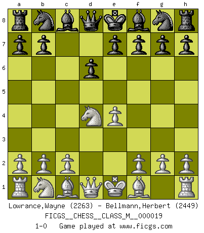 Last move : 1-0 2008 April 27 15:28:33 [Event "FICGS__CHESS__CLASS_M__000019"] [Site "FICGS"] [Date "2008.04.08"] [Round "1"] [White "Lowrance,Wayne"] [Black "Bellmann,Herbert"] [Result "1-0"] [WhiteElo "2263"] [BlackElo "2449"] 1.e4 c5 2.Nf3 d6 3.d4 cxd4 4.Nxd4 1-0 Sicilian Player White won this chess game. Follow this game move after move (download)The winner of the game is the player who makes the next-to-last mistake. (Savielly Tartakover) Verschiedene, sehr schätzbare und im Laufe des Lebens nützliche Eigenschaften des Geistes können durch das Schachspiel erworben und gekräftigt werden, so dass sie zu Gewohnheiten werden, die uns nie im Stich lassen. (Benjamin Franklin) Nos gusta pensar. (Gary Kasparov) Même un GMI sait rarement calculer sur plus de cinq coups une attaque à sacrifices. (Rudolf Spielmann) Train yourself to let go of everything you fear to lose. (Master Yoda in Star Wars ep.3)