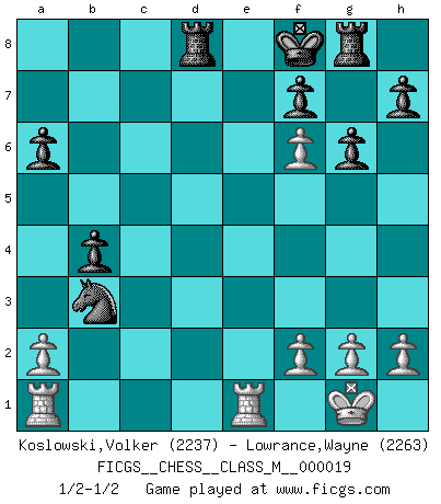 Last move : 1/2-1/2 2008 August 16 8:57:18 [Event "FICGS__CHESS__CLASS_M__000019"] [Site "FICGS"] [Date "2008.04.08"] [Round "1"] [White "Koslowski,Volker"] [Black "Lowrance,Wayne"] [Result "1/2-1/2"] [WhiteElo "2237"] [BlackElo "2263"] 1.e4 e5 2.Nf3 Nc6 3.Bb5 g6 4.c3 Nge7 5.d4 exd4 6.cxd4 d5 7.e5 a6 8.Ba4 Bg4 9.Bg5 Bxf3 10.Qxf3 b5 11.Bf6 Rg8 12.Bd1 Nxd4 13.Qc3 c5 14.b4 Ne6 15.bxc5 Bg7 16.O-O Bxf6 17.exf6 Nc6 18.Re1 Kf8 19.Bb3 b4 20.Qf3 Ncd4 21.Qxd5 Qxd5 22.Bxd5 Rd8 23.Bb3 Nxc5 24.Nd2 Ndxb3 25.Nxb3 Nxb3 1/2-1/2 Ruy Lopez : Fianchetto (Smyslov/Barnes) defense Kingside Castling by player White (move 16) This chess game ended in a draw. Follow this game move after move (download)There's never before been a Chess player with such a thorough knowledge of the intricacies of the game and such an absolutely indomitable will to win. I think Bobby is the greatest player that ever lived. (Lisa Lane) Das ganze Leben mit einer Ehefrau ist wie ein Endspiel mit ungleichfarbigen Läufern. (Viktor Kortschnoi) La belleza de un movimiento no se refleja solo en su apariencia, sino en el pensamiento detrás de él. (Siegbert Tarrasch) Psychologiquement, tu dois avoir confiance en toi même, mais cette confiance doit être basée sur des faits. (Robert Fischer) A belief is an idea the mind possesses, an idea that possesses the mind. (Robert Oxden Bolton)