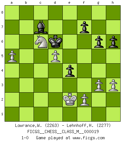 Last move : 1-0 2009 February 11 12:9:17 [Event "FICGS__CHESS__CLASS_M__000019"] [Site "FICGS"] [Date "2008.04.08"] [Round "1"] [White "Lowrance,Wayne"] [Black "Lehnhoff,Heinz-Georg"] [Result "1-0"] [WhiteElo "2263"] [BlackElo "2277"] 1.e4 c5 2.Nf3 d6 3.Nc3 Nf6 4.d4 cxd4 5.Nxd4 a6 6.Bg5 e6 7.Qf3 h6 8.Be3 e5 9.Nb3 b5 10.Bd3 Be7 11.O-O O-O 12.h3 Nbd7 13.a4 b4 14.Ne2 Bb7 15.c4 bxc3 16.Nxc3 Rb8 17.Nd2 Qc7 18.Rac1 Nc5 19.Bc4 Bc6 20.b3 Qb7 21.Bxc5 dxc5 22.Qe2 Ra8 23.Rfd1 Rfe8 24.Nf3 Bf8 25.Nd5 Bxd5 26.Rxd5 Nxd5 27.Bxd5 Qc7 28.Bxa8 Rxa8 29.Rc3 Be7 30.Qc4 a5 31.g3 Rd8 32.Rd3 Rxd3 33.Qxd3 g6 34.Qd5 Bf6 35.Ne1 Qd8 36.Nd3 Qxd5 37.exd5 Kf8 38.Kf1 Ke8 39.Ke2 Bg7 40.Nxc5 Bf8 41.Na6 e4 42.Nb8 Bd6 43.Nc6 Bc7 44.b4 axb4 45.Nxb4 Kd7 46.Nc6 Kd6 47.a5 1-0 Sicilian Kingside Castling by player White (move 11) Kingside Castling by player Black (move 11) Player White won this chess game. Follow this game move after move (download)Chess is like life. (Boris Spassky) Wie, soll nun auch die Opposition abgeschafft werden? Ja, es tut mir leid, Ihnen diesen Schmerz nicht ersparen zu können. (Aaron Nimzowitsch) El hombre es un frívolo, una creatura engañosa y como un jugador de Ajedrez, se preocupa mas por el proceso de obtener su meta que de la meta por sí misma. (Dostoyevsky) J'ai vu le vaincu d'Echecs jouer des années durant dans l'espoir de la fête de la victoire. Car tu es plus riche de ce qu'elle existe si même elle n'est point pour toi. Ainsi de la perle du fond des mers. (Antoine de Saint-Exupéry) Man is still the most extraordinary computer of all. (John F. Kennedy)