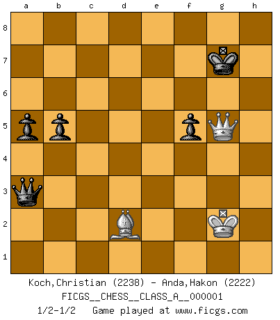Last move : 1/2-1/2 2006 August 21 15:57:49 [Event "FICGS__CHESS__CLASS_A__000001"] [Site "FICGS"] [Date "2006.04.08"] [Round "1"] [White "Koch,Christian"] [Black "Anda,Hakon"] [Result "1/2-1/2"] [WhiteElo "2238"] [BlackElo "2222"] 1.e4 e6 2.d4 d5 3.Nc3 Nf6 4.exd5 exd5 5.Bd3 Nc6 6.Nf3 Bg4 7.Be3 Be7 8.h3 Bh5 9.O-O O-O 10.g4 Bg6 11.Ne5 Nxe5 12.dxe5 Ne4 13.f4 Nxc3 14.bxc3 Bxd3 15.Qxd3 c6 16.c4 dxc4 17.Qxc4 Qc7 18.Rad1 Rad8 19.Kg2 Bh4 20.g5 Rfe8 21.Qe4 Rd5 22.Qf3 Qa5 23.Qg4 Qc3 24.Kf3 Qxc2 25.Rc1 Qa4 26.Qxh4 Rdxe5 27.Rfe1 R5e6 28.Re2 Qe4+ 29.Kf2 f6 30.gxf6 Rxf6 31.Qh5 b6 32.Rc4 Qe7 33.Bc1 Re6 34.R4c2 g6 35.Rxe6 Qxe6 36.Qf3 Qe1+ 37.Kg2 Re6 38.a3 a5 39.h4 Rd6 40.h5 b5 41.f5 Rf6 42.Bf4 Qe8 43.Qd3 Rxf5 44.Re2 Qf8 45.Bd2 Rd5 46.Qe4 Qf7 47.Rf2 Rf5 48.Rxf5 gxf5 49.Qxc6 Qxh5 50.Qe6+ Qf7 51.Qc8+ Qf8 52.Qc6 Qxa3 53.Qe6+ Kh8 54.Qf7 h5 55.Qxh5+ Kg7 56.Qg5+ 1/2-1/2 French defense Kingside Castling by player White (move 9) Kingside Castling by player Black (move 9) 10 pieces endgame at move 49 : White KQBP , Black KQPPPP WHITE : King + 1 Queen 1 Bishop 1 Pawn BLACK : King + 1 Queen 4 Pawns 9 pieces endgame at move 52 : White KQB , Black KQPPPP WHITE : King + 1 Queen 1 Bishop BLACK : King + 1 Queen 4 Pawns 8 pieces endgame at move 55 : White KQB , Black KQPPP WHITE : King + 1 Queen 1 Bishop BLACK : King + 1 Queen 3 Pawns This chess game ended in a draw. Follow this game move after move (download)Excellence at Chess is one mark of a scheming mind. (Sir Arthur Conan Doyle) Ihnen, Herr Lasker, habe ich nur drei Worte zu sagen: Schach und matt. (Siegbert Tarrasch) Si un gobernante no entiende al Ajedrez, ¿como puede governar él un reinado?. (El Rey Khusros II) J'apprécie les joueurs d'est-indienne, c'est grâce à eux que je nourris ma famille depuis tant d'années. (Petrosian) The ego is not master in its own house. (Sigmund Freud)