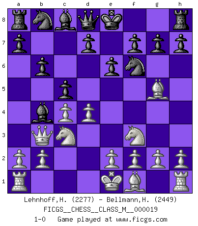 Last move : 1-0 2008 April 27 15:29:35 [Event "FICGS__CHESS__CLASS_M__000019"] [Site "FICGS"] [Date "2008.04.08"] [Round "1"] [White "Lehnhoff,Heinz-Georg"] [Black "Bellmann,Herbert"] [Result "1-0"] [WhiteElo "2277"] [BlackElo "2449"] 1.d4 Nf6 2.c4 e6 3.Nc3 Bb4 4.Nf3 b6 5.Qb3 c5 6.Bg5 1-0 Nimzo-Indian : Three knights variation Player White won this chess game. Follow this game move after move (download)Look at Garry Kasparov. After he loses, invariably he wins the next game. He just kills the next guy. That's something that we have to learn to be able to do. (Maurice Ashley) Über Karpov: Er war und ist ein Vertreter der russischen Reaktionäre. Das steckt tief in seiner Seele, wehalb ich nicht nett mit ihm umgehen kann. (Viktor Kortschnoi) Todo lo que importa ante el tablero de Ajedrez son buenas jugadas. (Bobby Fischer) Il n'y a pas eu de défaite parce que je ne crois pas que cet ordinateur ait jamais existé. IBM a triché en refusant d'imprimer les modes de recherche de la machine. C'est évident, pendant le match, des coups décisifs ont été joués par des êtres humains. Aujourd'hui, les meilleurs spécialistes en informatique ne peuvent toujours pas expliquer comment Deep-Blue a pu jouer contre la logique des ordinateurs. IBM a gagné une guerre de communication, mais ils sont incapables de prouver que l'ordinateur a gagné tout seul. (Garry Kasparov) Rules and bones are meant to be broken. (Anonymous)
