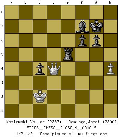 Last move : 1/2-1/2 2009 August 19 9:46:6 [Event "FICGS__CHESS__CLASS_M__000019"] [Site "FICGS"] [Date "2008.04.08"] [Round "1"] [White "Koslowski,Volker"] [Black "Domingo,Jordi"] [Result "1/2-1/2"] [WhiteElo "2237"] [BlackElo "2200"] 1.e4 e5 2.Ne2 Nf6 3.f4 Nxe4 4.d3 Nc5 5.fxe5 Nc6 6.g3 Nxe5 7.Bg2 Ne6 8.d4 Ng4 9.d5 Nc5 10.O-O d6 11.b4 Nd7 12.Nd4 Nge5 13.Qe1 g6 14.Nc3 Bg7 15.Ncb5 O-O 16.h4 Nb6 17.Bg5 Qd7 18.Bf6 Bxf6 19.Rxf6 Re8 20.Qc3 Nec4 21.Re1 Re5 22.R6f1 h5 23.Na3 Nxa3 24.Qxa3 Nxd5 25.Bxd5 Rxd5 26.Qf3 Rxd4 27.Qf6 Rxb4 28.Re7 Qe6 29.Rxe6 Bxe6 30.Re1 Bxa2 31.Qa1 Bd5 32.Qa5 c5 33.Qc7 Rb6 34.Qe7 a5 35.g4 Bf3 36.gxh5 Bxh5 37.Qc7 Rb4 38.Re7 Rg4+ 39.Kf2 Rf4+ 40.Kg3 Rf3+ 41.Kg2 b5 42.Qxd6 Rf5 43.Re5 Rxe5 44.Qxe5 a4 45.Qd5 Re8 46.Qc6 Re2+ 47.Kg1 b4 48.Qxa4 Re5 49.Kf2 Rf5+ 50.Ke1 Bf3 51.Qe8+ Kg7 52.Qe3 Kf6 53.Kd2 Rd5+ 54.Kc1 Bg4 55.c3 bxc3 56.Qxc3+ Ke7 57.Qg3 Be6 58.Qb8 Kf6 59.Qh8+ Ke7 60.Qb8 Rf5 61.Kc2 Rh5 62.Kd2 Kf6 63.Qb2+ Ke7 64.Qb8 Rf5 65.Kc2 f6 66.Qc7+ Kf8 67.Qd6+ Kf7 68.Kc3 c4 69.Qc6 Bd5 70.Qc7+ Kg8 71.Kb4 Bf7 72.Qb7 Rh5 73.Qe4 Kg7 74.Qf4 Rh8 75.Kc3 Rd8 76.Qg4 Rd3+ 77.Kc2 Re3 78.Qd4 Re5 1/2-1/2 Alapin's Opening Kingside Castling by player White (move 10) Kingside Castling by player Black (move 15) 10 pieces endgame at move 55 : White KQP , Black KRBPPPP WHITE : King + 1 Queen 1 Pawn BLACK : King + 1 Rook 1 Bishop 4 Pawns 9 pieces endgame at move 56 : White KQP , Black KRBPPP WHITE : King + 1 Queen 1 Pawn BLACK : King + 1 Rook 1 Bishop 3 Pawns This chess game ended in a draw. Follow this game move after move (download)Chess is a beautiful mistress. (Bent Larsen) Woher wissen wir, daß der Neanderthaler Blindschach gespielt hat? -- Bei Ausgrabungen wurden keine Schachbretter und Figuren gefunden. (Anonymous) Aquellos que dicen entender al Ajedrez, no entienden nada. (Robert Hubner) Si je n'étais pas joueur d'échecs, je serais le meilleur dans quelque chose d'autre. (Anatoli Karpov) When I took office, only high energy physicists had ever heard of what is called the World Wide Web... Now even my cat has its own page. (Bill Clinton, 1996)