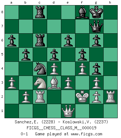 Last move : 0-1 2008 December 31 16:53:1 [Event "FICGS__CHESS__CLASS_M__000019"] [Site "FICGS"] [Date "2008.04.08"] [Round "1"] [White "Sanchez,Eduardo"] [Black "Koslowski,Volker"] [Result "0-1"] [WhiteElo "2228"] [BlackElo "2237"] 1.d4 Nf6 2.Nf3 c5 3.c3 cxd4 4.cxd4 d5 5.Nc3 Nc6 6.Bf4 Bf5 7.e3 e6 8.Qb3 Bb4 9.Bb5 O-O 10.O-O Qe7 11.Nh4 Bg6 12.Nxg6 hxg6 13.Rfc1 Na5 14.Qd1 Nh5 15.Be5 f6 16.Bg3 Nxg3 17.hxg3 a6 18.Bd3 f5 19.Rc2 Bd6 20.f4 g5 21.Qh5 Qf7 22.Qh3 g4 23.Qh2 g6 24.Qh6 Rfc8 25.Kf2 Bf8 26.Qh2 Rc6 27.Rh1 Qg7 28.Qg1 Rac8 29.Qe1 Bb4 30.Qa1 Qc7 31.Rh6 Qf7 32.a3 Bf8 33.Rh2 b5 34.Qc1 Qb7 35.Qh1 Qg7 36.Qe1 Nc4 0-1 This chess game has been lost on time (started : 2008.04.08 18:2:54) Queen's pawn game Kingside Castling by player Black (move 9) Kingside Castling by player White (move 10) Player Black won this chess game. Follow this game move after move (download)Excellence at Chess is one mark of a scheming mind. (Sir Arthur Conan Doyle) Es gibt Leute, die glauben, alles wäre vernünftig, was man mit einem ernsthaften Gesicht tut. (Georg Christoph Lichtenberg) Ser exitoso en el Ajedrez te permite descubrir tu propia personalidad. Eso es lo que deseo para los niños de mi clase. (Saudin Robovic) Les échecs sont utiles à l'exercice de la faculté de penser et à celle de l'imagination. Car nous devons posséder une méthode élaborée pour atteindre des buts partout où nous devons conduire notre raison. (Leibnitz) It is not true that people stop pursuing dreams because they grow old, they grow old because they stop pursuing dreams. (Gabriel Garcia Marquez)
