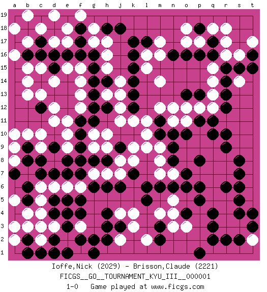 Last move : 1-0 2008 June 18 19:24:47 [Event "FICGS__GO__TOURNAMENT_KYU_III__000001"] [Site "FICGS"] [Date "2008.04.09"] [Round "1"] [Black "Ioffe,Nick"] [White "Brisson,Claude"] [Result "1-0"] [Rating 1 "2029"] [Rating 2 "2221"] 1.q16 d17 2.d15 c5 3.q3 c13 4.c17 c18 5.d18 e18 6.b18 d19 7.c16 b15 8.d13 d12 9.f16 g17 10.r9 h15 11.c14 b14 12.c12 b13 13.e12 d11 14.e14 c15 15.d16 d14 16.e13 e11 17.g12 k3 18.k16 r16 19.r15 r17 20.q17 q15 21.s15 q18 22.o16 o17 23.p18 p17 24.p16 r18 25.n16 q14 26.r13 o18 27.e4 d3 28.d4 c4 29.e3 c3 30.j3 j4 31.h4 k4 32.h3 o3 33.p5 n5 34.p13 q13 35.r12 q12 36.q11 p12 37.o10 n12 38.m10 m14 39.k14 l15 40.k15 l16 41.l17 m17 42.k17 m16 43.h18 h17 44.j18 h13 45.k12 j13 46.k13 j11 47.f17 g18 48.f18 f19 49.f11 h10 50.f9 j8 51.j6 l11 52.c8 c10 53.b6 c6 54.c7 k11 55.l6 s3 56.s4 r4 57.s5 r3 58.q4 r5 59.r6 q6 60.s6 q5 61.o4 n4 62.p6 q7 63.q2 p7 64.o6 r8 65.s8 q9 66.r10 r7 67.s7 p10 68.p11 o9 69.n9 o11 70.n10 o8 71.q10 p9 72.n6 m8 73.n8 m7 74.m6 n7 75.o7 l9 76.s2 t2 77.r2 b19 78.g8 h7 79.h6 g7 80.f7 f6 81.e7 s14 82.r14 s16 83.m3 n3 84.m2 j2 85.h2 l2 86.l5 m4 87.p1 e6 88.g6 b17 89.b16 a18 90.b9 b10 91.b5 b4 92.b2 n11 93.p8 q8 94.t4 l10 95.t3 e2 96.f2 a5 97.a7 c2 98.c1 d1 99.b1 f3 100.f4 f1 101.g2 b3 102.g1 a2 103.e1 g10 104.f10 f1 105.h12 j12 106.e1 d6 107.d7 f1 108.g16 h16 109.e1 m9 110.p8 f1 111.m11 m12 112.e1 f13 113.g13 f1 114.o13 o12 115.e1 f14 116.g14 f1 117.h14 j14 118.e1 f15 119.d2 f12 120.g15 e15 121.g11 a9 122.e16 a8 123.h8 j7 124.j9 k9 125.b8 a10 126.k7 k8 127.t16 t17 128.t15 e9 129.d9 e10 130.e8 c9 131.f5 h9 132.e5 g9 133.f8 a16 134.d5 e17 135.a4 a3 136.d1 1-0 Here are the names of the openings (joseki) played in the four corners : Corner d16 : d17 d15 Komoku (Somok, Xiao~mu`) 3-4 Point. The komoku (3-4) point is the traditional corner enclosure move.. Ikken Takagakari (Hankan Nop'dakeolch'im, Yi Gaogua`jiao~, 1-Space High Approach). The 5-4 approach move has become more popular in modern times, as modern Go emphasizes speed and influence. Corner q16 : q16 r16 Hoshi (Hwajeom, Seongjeom, Xingwei`) 4-4 Point. The star or hoshi (4-4) point, emphasizing influence at the potential expense of territory. Corner d4 : c5 e4 Mokuhazushi (Waemok, Wai`mu`) 5-3 Point. The mokuhazushi (5-3) point was popular in the Edo period in Japan (1600 - 1867). It emphasizes influence; territorially, it is inferior to the 3-4 point. Takamoku Kakari. Black prevents White from gaining influence, but in the local context, abandoning profit in the corner entails a loss. White 3-4 and 4-4 are best. Player Black won this Go (weiqi, baduk) game. Follow this game move after move (download)You can hide nothing on the goban. (Pierre Audouard) Life is verb, not a noun. (Charlotte Perkins Gilman)