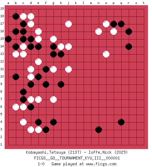 Last move : 1-0 2008 April 26 14:33:18 [Event "FICGS__GO__TOURNAMENT_KYU_III__000001"] [Site "FICGS"] [Date "2008.04.09"] [Round "1"] [Black "Kobayashi,Tetsuya"] [White "Ioffe,Nick"] [Result "1-0"] [Rating 1 "2137"] [Rating 2 "2029"] 1.r16 d17 2.q4 c4 3.e4 p16 4.p17 o17 5.q17 n16 6.r14 j17 7.d15 c13 8.c17 c18 9.c16 e16 10.b18 d18 11.e14 d10 12.d6 e3 13.f3 d3 14.g4 b6 15.n3 o13 16.c8 b15 17.b16 g15 18.b10 e12 19.g14 h14 20.g13 g11 21.h13 j14 22.b14 c14 23.c15 e15 24.d14 b13 25.a15 d7 26.c7 c6 27.d9 e7 28.e10 d11 29.f9 g7 30.h9 j11 31.f11 1-0 Here are the names of the openings (joseki) played in the four corners : Corner d4 : c4 e4 Komoku (Somok, Xiao~mu`) 3-4 Point. The komoku (3-4) point is the traditional corner enclosure move.. Ikken Takagakari (Hankan Nop'dakeolch'im, Yi Gaogua`jiao~, 1-Space High Approach). The 5-4 approach move has become more popular in modern times, as modern Go emphasizes speed and influence. Corner q16 : r16 p16 Komoku (Somok, Xiao~mu`) 3-4 Point. The komoku (3-4) point is the traditional corner enclosure move.. Ikken Takagakari (Hankan Nop'dakeolch'im, Yi Gaogua`jiao~, 1-Space High Approach). The 5-4 approach move has become more popular in modern times, as modern Go emphasizes speed and influence. Player Black won this Go (weiqi, baduk) game. Follow this game move after move (download)Those who are good at winning, don't usually fight. (Zhang) The problem with manipulation is that people can turn on you. (Horatio Caine, C.S.I. Miami)