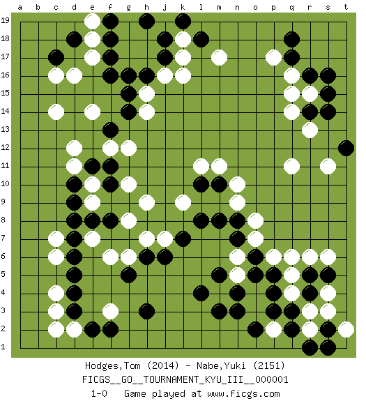 Last move : 1-0 2008 October 7 10:55:8 [Event "FICGS__GO__TOURNAMENT_KYU_III__000001"] [Site "FICGS"] [Date "2008.04.09"] [Round "1"] [Black "Hodges,Tom"] [White "Nabe,Yuki"] [Result "1-0"] [Rating 1 "2014"] [Rating 2 "2151"] 1.q3 d16 2.d4 q16 3.r14 q11 4.t12 s11 5.s16 r15 6.s15 q14 7.r16 q15 8.q17 p17 9.q18 r13 10.s14 k16 11.d10 q5 12.r5 r6 13.r4 q6 14.p4 f3 15.h3 c3 16.d3 c4 17.d5 d2 18.e2 c2 19.f2 c6 20.d6 c7 21.d8 k9 22.k7 n6 23.m5 n5 24.n4 m4 25.l4 o4 26.n3 o3 27.m3 p2 28.q2 d12 29.f17 e17 30.f16 c14 31.j17 k17 32.j18 j16 33.h16 h15 34.g16 h9 35.f11 j7 36.j6 h7 37.h6 e7 38.d7 g6 39.g5 f6 40.l8 e9 41.d9 e10 42.e11 d11 43.e8 g10 44.f13 g12 45.g15 h14 46.n8 n10 47.m10 m11 48.l10 l11 49.l18 k18 50.k19 m17 51.p5 p6 52.o5 q4 53.p3 o8 54.o6 n9 55.m8 o7 56.n7 r3 57.s5 r2 58.o2 s6 59.s2 s3 60.r1 t2 61.s1 s4 62.c17 e18 63.f18 c16 64.d18 e19 65.f19 j19 66.h19 e14 67.g14 f12 68.f8 g8 69.f10 1-0 This go game has been lost on time (started : 2008.04.09 19:38:27) Here are the names of the openings (joseki) played in the four corners : Corner q16 : q16 r14 Hoshi (Hwajeom, Seongjeom, Xingwei`) 4-4 Point. The star or hoshi (4-4) point, emphasizing influence at the potential expense of territory. Ikken Kakari (Hankan Keolch'im, Yi Gua`jiao~, 1-Space Low Approach). Black 2 is the standard approach move to the 4-4. Corner q4 : q3 q5 Komoku (Somok, Xiao~mu`) 3-4 Point. The komoku (3-4) point is the traditional corner enclosure move.. Ikken Takagakari (Hankan Nop'dakeolch'im, Yi Gaogua`jiao~, 1-Space High Approach). The 5-4 approach move has become more popular in modern times, as modern Go emphasizes speed and influence. Corner d4 : d4 f3 Hoshi (Hwajeom, Seongjeom, Xingwei`) 4-4 Point. The star or hoshi (4-4) point, emphasizing influence at the potential expense of territory. Ikken Kakari (Hankan Keolch'im, Yi Gua`jiao~, 1-Space Low Approach). White 2 is the standard approach move to the 4-4. Player Black won this Go (weiqi, baduk) game. Follow this game move after move (download)The possibility or impossibility of an event results logically from the rules. (Pierre Audouard) Never risk one's whole fortune unless supported by one's entire army. (Niccolo Machiavelli)
