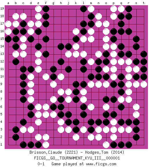 Last move : 0-1 2008 September 21 0:29:32 [Event "FICGS__GO__TOURNAMENT_KYU_III__000001"] [Site "FICGS"] [Date "2008.04.09"] [Round "1"] [Black "Brisson,Claude"] [White "Hodges,Tom"] [Result "0-1"] [Rating 1 "2221"] [Rating 2 "2014"] 1.q16 d17 2.r4 p4 3.q6 r3 4.s3 q3 5.s2 l3 6.c4 e4 7.d6 c3 8.b3 d3 9.b2 h4 10.d15 c13 11.e14 e13 12.f13 e12 13.c17 c18 14.c16 e18 15.f17 b17 16.c11 d10 17.c10 d9 18.c9 d8 19.c8 d7 20.c7 e6 21.d5 e5 22.r13 o17 23.m17 m16 24.l16 m15 25.l17 o15 26.q17 l15 27.k15 k14 28.j14 k13 29.q10 r8 30.q8 r9 31.q9 s11 32.n4 n3 33.m3 n2 34.m4 m2 35.o4 o3 36.p5 s6 37.q4 p3 38.l9 m6 39.l6 l7 40.l5 l8 41.k9 m9 42.l11 m12 43.j11 j8 44.g11 f10 45.j5 g7 46.k3 k2 47.k4 j3 48.h5 g5 49.m10 n9 50.n10 j13 51.h14 r14 52.q14 r15 53.q13 q15 54.s12 r11 55.s10 r10 56.t11 s9 57.t10 t9 58.t12 s5 59.s4 r12 60.s14 p11 61.p15 p14 62.p16 s13 63.t13 p13 64.s15 q12 65.r16 o16 66.b16 b18 67.f18 e19 68.h7 h8 69.k8 o6 70.o5 q7 71.p7 r7 72.o7 o9 73.o10 p10 74.p9 j7 75.k7 p18 76.q18 n18 77.d11 e11 78.e1 e2 79.d1 f1 80.c1 f2 81.m18 n17 82.g10 g9 83.g6 f5 84.h6 f6 85.f19 e17 86.e16 a16 87.a15 a17 88.b14 d16 89.f15 c15 90.b15 c14 91.b12 b13 92.n12 n13 93.l12 l13 94.h12 h10 95.o12 o11 96.n11 p12 97.o13 o14 98.j4 h3 99.p1 p2 100.q1 o1 101.r1 q19 102.r19 p19 103.r18 m19 104.l19 k16 0-1 Here are the names of the openings (joseki) played in the four corners : Corner q4 : r4 p4 Komoku (Somok, Xiao~mu`) 3-4 Point. The komoku (3-4) point is the traditional corner enclosure move.. Ikken Takagakari (Hankan Nop'dakeolch'im, Yi Gaogua`jiao~, 1-Space High Approach). The 5-4 approach move has become more popular in modern times, as modern Go emphasizes speed and influence. Corner d4 : c4 e4 Komoku (Somok, Xiao~mu`) 3-4 Point. The komoku (3-4) point is the traditional corner enclosure move.. Ikken Takagakari (Hankan Nop'dakeolch'im, Yi Gaogua`jiao~, 1-Space High Approach). The 5-4 approach move has become more popular in modern times, as modern Go emphasizes speed and influence. Corner d16 : d17 d15 Komoku (Somok, Xiao~mu`) 3-4 Point. The komoku (3-4) point is the traditional corner enclosure move.. Ikken Takagakari (Hankan Nop'dakeolch'im, Yi Gaogua`jiao~, 1-Space High Approach). The 5-4 approach move has become more popular in modern times, as modern Go emphasizes speed and influence. Player White won this Go (weiqi, baduk) game. Follow this game move after move (download)Six eyes in a rectangle are alive. (Anonymous) I've never seen so many men wasted so badly. (Blondie in The Good, The Bad and The Ugly)