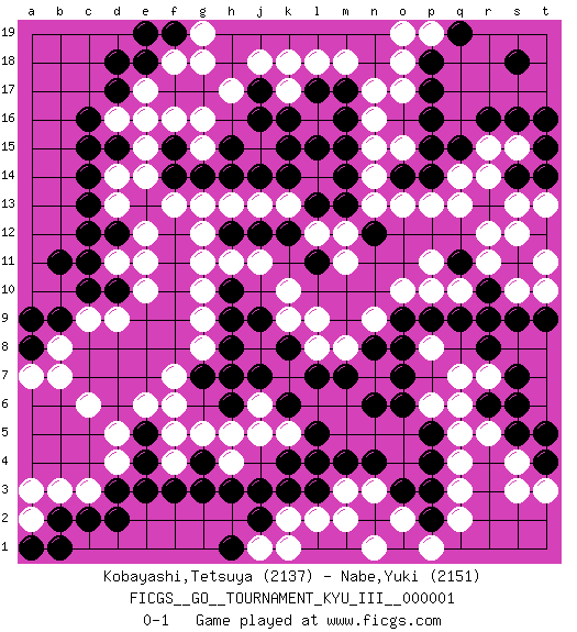 Last move : 0-1 2008 August 16 10:11:28 [Event "FICGS__GO__TOURNAMENT_KYU_III__000001"] [Site "FICGS"] [Date "2008.04.09"] [Round "1"] [Black "Kobayashi,Tetsuya"] [White "Nabe,Yuki"] [Result "0-1"] [Rating 1 "2137"] [Rating 2 "2151"] 1.r16 d4 2.c16 q4 3.l17 q13 4.p16 q10 5.o3 m3 6.m4 q2 7.l3 n3 8.n4 o2 9.n2 m2 10.p2 n1 11.p4 p1 12.p3 q3 13.p5 q5 14.f3 c6 15.d2 c3 16.j3 e17 17.r8 p6 18.r10 r11 19.s11 s10 20.r9 s12 21.q11 r12 22.p9 p11 23.s9 t11 24.r6 q6 25.l4 h17 26.d17 e16 27.c13 c9 28.s5 s4 29.c2 n17 30.p17 n15 31.l15 n13 32.h14 g15 33.g14 e14 34.d15 j15 35.m14 n14 36.j14 e15 37.k15 o18 38.p18 s15 39.s16 h4 40.h3 f4 41.g4 g5 42.g3 d11 43.b11 g11 44.e4 f5 45.e5 e6 46.d3 d5 47.e3 b3 48.h6 h5 49.h9 j11 50.j17 j18 51.j16 k18 52.h15 g16 53.k6 g8 54.h8 g9 55.h10 g10 56.c10 d9 57.b9 b8 58.a8 b7 59.g7 f7 60.n6 k10 61.e18 f18 62.d18 k1 63.j2 j1 64.h1 k2 65.k3 l2 66.b2 a2 67.f19 g18 68.t4 t3 69.t5 s3 70.o7 l9 71.k8 m8 72.m7 p19 73.q19 o19 74.s18 k17 75.l13 k13 76.k12 j13 77.j12 h13 78.h12 g13 79.k14 g12 80.l11 h11 81.m13 m12 82.n12 m11 83.m15 l12 84.k16 l18 85.m17 m18 86.d12 e12 87.d10 e10 88.c11 e11 89.s14 r15 90.q15 r14 91.t15 s13 92.t14 t13 93.t16 d14 94.c14 d13 95.c12 d16 96.c15 o10 97.o9 n9 98.q9 p10 99.p14 p13 100.o14 o13 101.f14 f13 102.o6 r5 103.s7 k5 104.l5 j6 105.j7 j5 106.f15 f16 107.n8 l8 108.l7 a7 109.a9 g19 110.e19 q7 111.m16 o15 112.p15 r7 113.s6 p8 114.o8 k9 115.t9 t10 116.j9 q14 117.b1 n16 118.a1 a3 119.k4 f6 120.h7 o17 0-1 Here are the names of the openings (joseki) played in the four corners : Corner q4 : q4 o3 Hoshi (Hwajeom, Seongjeom, Xingwei`) 4-4 Point. The star or hoshi (4-4) point, emphasizing influence at the potential expense of territory. Ikken Kakari (Hankan Keolch'im, Yi Gua`jiao~, 1-Space Low Approach). Black 2 is the standard approach move to the 4-4. Corner d4 : d4 f3 Hoshi (Hwajeom, Seongjeom, Xingwei`) 4-4 Point. The star or hoshi (4-4) point, emphasizing influence at the potential expense of territory. Ikken Kakari (Hankan Keolch'im, Yi Gua`jiao~, 1-Space Low Approach). Black 2 is the standard approach move to the 4-4. Corner d16 : c16 e17 Komoku (Somok, Xiao~mu`) 3-4 Point. The komoku (3-4) point is the traditional corner enclosure move.. Ikken Kakari (Hankan Keolch'im, Yi Gua`jiao~, 1-Space Low Pincer). The small knight move is the basic approach move to the 3-4 point stone. It has been continually used for over four centuries. There are limitless variations, with new moves constantly being discovered. White 2 opens the door to a treaure store of joseki. Player White won this Go (weiqi, baduk) game. Follow this game move after move (download)If White takes all four corners, Black should resign; if Black takes all four corners, Black should also resign. (David Kent) If things go wrong, don't go with them. (Roger Babson)