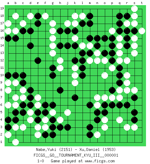 Last move : 1-0 2008 May 14 9:44:55 [Event "FICGS__GO__TOURNAMENT_KYU_III__000001"] [Site "FICGS"] [Date "2008.04.09"] [Round "1"] [Black "Nabe,Yuki"] [White "Xu,Daniel"] [Result "1-0"] [Rating 1 "2151"] [Rating 2 "1953"] 1.r16 d4 2.d16 q4 3.c6 f3 4.b4 c3 5.c9 k17 6.r6 r8 7.p6 o3 8.q9 q8 9.p8 r9 10.q10 r10 11.q11 r12 12.p13 s14 13.m17 g17 14.r14 s15 15.r15 s13 16.d14 d18 17.e18 c17 18.c16 b16 19.b15 b18 20.e17 a17 21.a15 a16 22.m15 k15 23.l13 l18 24.m18 g15 25.j14 g13 26.h14 g14 27.j16 j17 28.h16 g16 29.g11 h12 30.k12 h11 31.g10 k11 32.l11 k10 33.l10 k9 34.k7 f18 35.h3 b3 36.s4 r3 37.m3 s3 38.e4 e3 39.e5 q7 40.q6 p7 41.o6 o7 42.n4 n6 43.n5 o4 44.m6 n7 45.o5 o10 46.e12 q12 47.p12 p11 48.h8 j5 49.g4 f4 50.f5 g5 51.j3 d5 52.d6 h4 53.g3 e6 54.f6 e7 55.g6 c7 56.d7 c8 57.d8 b9 58.c10 b6 59.b5 b7 60.c5 a8 61.b10 a6 62.a10 a9 63.a3 a2 64.a4 b1 65.f2 e2 66.g2 n2 67.m2 m12 68.l12 n13 69.n14 o14 70.o13 q13 71.p14 q14 72.p15 q15 73.q16 m14 74.n15 l14 75.k14 o12 76.m13 n12 77.k16 p16 78.o15 s17 79.s16 t16 80.r18 r17 81.q17 s18 82.q18 s19 83.s7 s8 84.l17 k18 85.s5 1-0 Here are the names of the openings (joseki) played in the four corners : Corner d4 : d4 c6 Hoshi (Hwajeom, Seongjeom, Xingwei`) 4-4 Point. The star or hoshi (4-4) point, emphasizing influence at the potential expense of territory. Ikken Kakari (Hankan Keolch'im, Yi Gua`jiao~, 1-Space Low Approach). Black 2 is the standard approach move to the 4-4. Corner q4 : q4 r6 Hoshi (Hwajeom, Seongjeom, Xingwei`) 4-4 Point. The star or hoshi (4-4) point, emphasizing influence at the potential expense of territory. Ikken Kakari (Hankan Keolch'im, Yi Gua`jiao~, 1-Space Low Approach). Black 2 is the standard approach move to the 4-4. Corner d16 : d16 g17 Hoshi (Hwajeom, Seongjeom, Xingwei`) 4-4 Point. The star or hoshi (4-4) point, emphasizing influence at the potential expense of territory. Nikken Kakari (Dukan Keolch'im, E`r Gua`jiao~, 2-Space Low Approach). Black typically answers by 7-3 or 3-5 (which is not joseki). Player Black won this Go (weiqi, baduk) game. Follow this game move after move (download)Territory really exists only in the end. (Pierre Audouard) Games, world of games... There's always an opponent, and there's always a victim. (Revolver, movie)