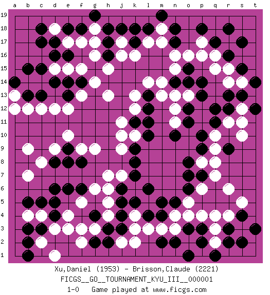 Last move : 1-0 2008 June 12 14:9:47 [Event "FICGS__GO__TOURNAMENT_KYU_III__000001"] [Site "FICGS"] [Date "2008.04.09"] [Round "1"] [Black "Xu,Daniel"] [White "Brisson,Claude"] [Result "1-0"] [Rating 1 "1953"] [Rating 2 "2221"] 1.q17 r4 2.p3 e3 3.d16 n3 4.r3 s3 5.s2 q3 6.r2 q4 7.s4 s5 8.t3 r6 9.d6 f17 10.d14 k16 11.n17 r15 12.q12 r17 13.r18 q16 14.s17 p17 15.r16 p16 16.s15 r14 17.r9 s12 18.o12 n15 19.p18 c12 20.b13 c8 21.c3 c4 22.d4 d3 23.c5 b4 24.b3 d18 25.c17 b12 26.c13 d12 27.h17 f15 28.k17 l17 29.l18 j17 30.k18 j16 31.j18 m17 32.n18 f13 33.c18 r11 34.q11 q10 35.p10 q9 36.p9 q8 37.p2 p4 38.h3 e4 39.d5 h4 40.j3 g3 41.j4 h5 42.g2 f2 43.g4 f3 44.j5 h6 45.j6 h7 46.n5 o4 47.f6 f5 48.e8 d9 49.k8 j9 50.k9 j10 51.l11 k12 52.l12 k13 53.k11 j11 54.o7 b7 55.b5 g18 56.h18 j7 57.k7 k10 58.l10 a13 59.a14 a12 60.b15 q2 61.q1 l3 62.m4 k2 63.m2 m3 64.n2 o2 65.o1 l5 66.l4 k4 67.m5 k3 68.k5 j2 69.h2 f9 70.p14 m13 71.o15 n16 72.s13 s14 73.r12 s10 74.t12 s11 75.t14 o16 76.n14 m14 77.r13 q15 78.e18 p8 79.o8 n12 80.o11 n11 81.n10 g16 82.e9 e10 83.f8 g9 84.f18 o13 85.p13 c2 86.b2 d1 87.b1 e17 88.d17 g17 89.g19 g6 90.e6 p6 91.o3 n4 92.e13 e12 93.f14 g14 94.e14 m18 95.m19 e15 96.h16 h15 97.e16 d15 98.c15 h13 99.p7 q7 100.d8 b9 101.l13 l14 102.o6 o5 103.l6 n13 104.o14 1-0 Here are the names of the openings (joseki) played in the four corners : Corner q4 : r4 p3 Komoku (Somok, Xiao~mu`) 3-4 Point. The komoku (3-4) point is the traditional corner enclosure move.. Ikken Kakari (Hankan Keolch'im, Yi Gua`jiao~, 1-Space Low Pincer). The small knight move is the basic approach move to the 3-4 point stone. It has been continually used for over four centuries. There are limitless variations, with new moves constantly being discovered. Black 2 opens the door to a treaure store of joseki. Corner d4 : e3 d6 Mokuhazushi (Waemok, Wai`mu`) 5-3 Point. The mokuhazushi (5-3) point was popular in the Edo period in Japan (1600 - 1867). It emphasizes influence; territorially, it is inferior to the 3-4 point. Corner d16 : d16 f17 Hoshi (Hwajeom, Seongjeom, Xingwei`) 4-4 Point. The star or hoshi (4-4) point, emphasizing influence at the potential expense of territory. Ikken Kakari (Hankan Keolch'im, Yi Gua`jiao~, 1-Space Low Approach). White 2 is the standard approach move to the 4-4. Player Black won this Go (weiqi, baduk) game. Follow this game move after move (download)Learning josekis by heart is useless if you don't try departing from them. (Pierre Audouard) You lose, general Kenobi. (General Grievous in Star Wars ep.3)