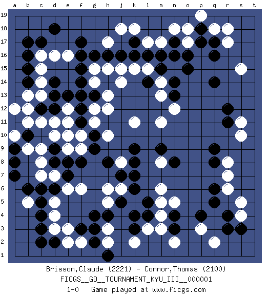Last move : 1-0 2008 August 16 20:18:7 [Event "FICGS__GO__TOURNAMENT_KYU_III__000001"] [Site "FICGS"] [Date "2008.04.09"] [Round "1"] [Black "Brisson,Claude"] [White "Connor,Thomas"] [Result "1-0"] [Rating 1 "2221"] [Rating 2 "2100"] 1.q16 d4 2.r4 d16 3.f3 h3 4.c3 d3 5.c4 d5 6.d2 e2 7.c2 e3 8.c6 p3 9.q6 m4 10.f17 h17 11.f15 c14 12.d18 l17 13.c17 c11 14.r11 o17 15.q14 c8 16.d6 e6 17.d8 c9 18.e7 f6 19.k3 l3 20.k4 m6 21.h4 h5 22.g4 f2 23.g3 h2 24.j5 h6 25.k7 m8 26.k9 r8 27.q8 r7 28.q9 r6 29.q5 s4 30.s3 s5 31.r3 s10 32.n3 k2 33.n4 n5 34.p4 b5 35.c5 c7 36.b6 d7 37.g9 j6 38.k6 j8 39.k8 h10 40.f11 k11 41.l5 m5 42.l4 m3 43.m9 s11 44.r12 r17 45.q17 q18 46.p18 r18 47.p17 s15 48.o16 f13 49.g13 g12 50.f12 h13 51.e13 g14 52.f14 c16 53.d14 c13 54.b17 e12 55.g13 n16 56.o15 m11 57.n8 n15 58.n14 m14 59.n13 m13 60.h14 f13 61.g2 n2 62.g13 g15 63.g16 h15 64.h16 j15 65.j16 j18 66.k17 k18 67.l16 m17 68.m15 k15 69.k16 o18 70.a9 b9 71.a8 a10 72.a7 f13 73.d12 e11 74.g13 n12 75.e10 d11 76.f13 h12 77.l14 l15 78.m16 j14 79.n17 n18 80.n16 p19 81.b15 c15 82.b16 f10 83.g10 f9 84.f8 e9 85.d9 d10 86.e8 e10 87.h8 g11 88.j7 q2 89.d13 a12 90.c12 b12 91.b10 b11 92.a11 e16 93.f16 a10 94.b14 b13 95.h1 1-0 Comment by player 2 : Thomas Connor : Merci pour la partie Here are the names of the openings (joseki) played in the four corners : Corner d4 : d4 f3 Hoshi (Hwajeom, Seongjeom, Xingwei`) 4-4 Point. The star or hoshi (4-4) point, emphasizing influence at the potential expense of territory. Ikken Kakari (Hankan Keolch'im, Yi Gua`jiao~, 1-Space Low Approach). Black 2 is the standard approach move to the 4-4. Corner q4 : r4 p3 Komoku (Somok, Xiao~mu`) 3-4 Point. The komoku (3-4) point is the traditional corner enclosure move.. Ikken Kakari (Hankan Keolch'im, Yi Gua`jiao~, 1-Space Low Pincer). The small knight move is the basic approach move to the 3-4 point stone. It has been continually used for over four centuries. There are limitless variations, with new moves constantly being discovered. White 2 opens the door to a treaure store of joseki. Corner d16 : d16 f17 Hoshi (Hwajeom, Seongjeom, Xingwei`) 4-4 Point. The star or hoshi (4-4) point, emphasizing influence at the potential expense of territory. Ikken Kakari (Hankan Keolch'im, Yi Gua`jiao~, 1-Space Low Approach). Black 2 is the standard approach move to the 4-4. Corner q16 : q16 l17 Hoshi (Hwajeom, Seongjeom, Xingwei`) 4-4 Point. The star or hoshi (4-4) point, emphasizing influence at the potential expense of territory. Player Black won this Go (weiqi, baduk) game. Follow this game move after move (download)At the head of two stones in a row, play hane. (Anonymous) A bird doesn't sing because it has an answer, it sings because it has a song. (Maya Angelou)