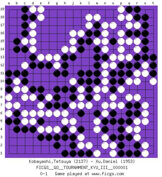 Last move : 0-1 2008 June 9 13:26:47 [Event "FICGS__GO__TOURNAMENT_KYU_III__000001"] [Site "FICGS"] [Date "2008.04.09"] [Round "1"] [Black "Kobayashi,Tetsuya"] [White "Xu,Daniel"] [Result "0-1"] [Rating 1 "2137"] [Rating 2 "1953"] 1.r16 p16 2.q3 r17 3.c4 d16 4.s17 q17 5.s15 p14 6.r13 k16 7.c14 c12 8.c17 d17 9.c16 d15 10.b14 d14 11.m17 l17 12.m16 n14 13.o15 p15 14.k15 j15 15.m14 n15 16.k14 h14 17.m13 o12 18.m11 r8 19.r6 r11 20.r18 q18 21.s18 k3 22.f3 n3 23.q11 r10 24.q12 p9 25.o11 n12 26.m12 n11 27.o10 n10 28.o9 p7 29.c10 c8 30.d9 b10 31.b11 b9 32.c11 d8 33.e8 e7 34.f7 f8 35.e9 f6 36.g7 d6 37.e5 e6 38.b6 g6 39.h7 h6 40.g9 r4 41.q5 q4 42.p4 r3 43.p2 q2 44.p3 s6 45.p5 s5 46.r2 s2 47.q1 h3 48.h13 g13 49.h12 g12 50.h11 o17 51.g2 o2 52.n4 m4 53.n5 m5 54.o3 n2 55.d18 e18 56.c18 e19 57.d13 e13 58.d12 l18 59.l9 j7 60.j8 h8 61.g8 k8 62.j9 n6 63.o5 l7 64.j2 h2 65.h1 m18 66.l16 j16 67.e12 f13 68.j3 j4 69.h4 k2 70.g3 k9 71.k10 j10 72.h9 l10 73.k11 h5 74.m10 c5 75.b5 d5 76.d4 s1 77.r1 s12 78.s13 e4 79.e3 g4 80.h3 f4 81.r7 s7 82.r12 s11 83.g11 j14 84.j13 q10 85.p10 m9 86.l11 m8 87.q19 p19 88.r19 n17 89.q16 p18 90.o6 o8 91.t12 n9 92.p11 o7 93.k1 l2 94.q7 q8 95.t11 t10 96.t13 b7 97.l1 m1 98.j1 c15 99.b15 r5 100.q6 o1 101.p1 m15 102.l15 d19 103.c19 r14 104.s14 r15 105.a10 n16 106.f12 a6 107.a5 a7 108.a9 a8 109.a11 c6 110.b4 c9 111.n13 o13 112.k6 k7 113.k4 j5 114.m6 n7 115.l10 q15 116.s16 q13 117.p12 p13 118.l8 pass 119.pass pass 0-1 Here are the names of the openings (joseki) played in the four corners : Corner q16 : r16 p16 Komoku (Somok, Xiao~mu`) 3-4 Point. The komoku (3-4) point is the traditional corner enclosure move.. Ikken Takagakari (Hankan Nop'dakeolch'im, Yi Gaogua`jiao~, 1-Space High Approach). The 5-4 approach move has become more popular in modern times, as modern Go emphasizes speed and influence. Corner d16 : d16 c14 Hoshi (Hwajeom, Seongjeom, Xingwei`) 4-4 Point. The star or hoshi (4-4) point, emphasizing influence at the potential expense of territory. Ikken Kakari (Hankan Keolch'im, Yi Gua`jiao~, 1-Space Low Approach). Black 2 is the standard approach move to the 4-4. Corner q4 : q3 r8 Komoku (Somok, Xiao~mu`) 3-4 Point. The komoku (3-4) point is the traditional corner enclosure move.. Player White won this Go (weiqi, baduk) game. Follow this game move after move (download)Don't disturb symmetry. (Anonymous) The beginning of wisdom is silence. The second step is listening. (Unknown)