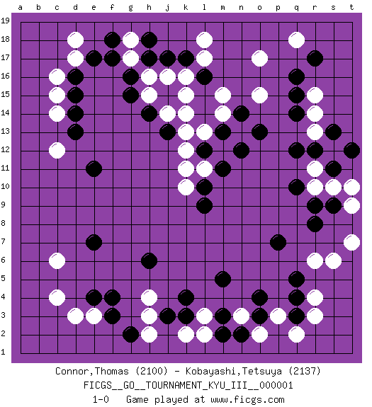 Last move : 1-0 2008 June 22 9:45:58 [Event "FICGS__GO__TOURNAMENT_KYU_III__000001 "] [Site "FICGS"] [Date "2008.04.09"] [Round "1"] [Black "Connor,Thomas "] [White "Kobayashi,Tetsuya "] [Result "1-0"] [Rating 1 "2100"] [Rating 2 "2137"] 1.q16 c4 2.q4 d17 3.e4 e3 4.f3 d3 5.f4 c6 6.k4 r6 7.r8 r3 8.q3 r4 9.q5 s6 10.p7 o17 11.l16 o15 12.q14 q18 13.r17 l18 14.d15 c15 15.d16 c16 16.e17 c14 17.d14 d18 18.d13 c12 19.e7 h2 20.g2 l3 21.k3 k2 22.m2 l2 23.m5 n3 24.n2 o2 25.o3 h4 26.j3 h3 27.h6 p3 28.o4 q2 29.m3 g17 30.o13 k11 31.l10 k10 32.l9 l11 33.m11 m12 34.n12 m14 35.m13 l13 36.l12 k12 37.g16 h16 38.g15 h15 39.f17 g18 40.e11 r10 41.r9 r15 42.q15 r14 43.r12 s12 44.s13 r13 45.s11 r11 46.q12 s10 47.t12 t7 48.s9 t9 49.q10 t10 50.n14 m15 51.h14 j14 52.j13 k13 53.j15 k14 54.h17 j16 55.j17 k16 56.k17 k15 57.f18 l17 58.h18 1-0 Here are the names of the openings (joseki) played in the four corners : Corner d4 : c4 e4Komoku (Somok, Xiao~mu`) 3-4 Point. The komoku (3-4) point is the traditional corner enclosure move..Ikken Takagakari (Hankan Nop'dakeolch'im, Yi Gaogua`jiao~, 1-Space High Approach). The 5-4 approach move has become more popular in modern times, as modern Go emphasizes speed and influence. Corner q4 : q4 r6Hoshi (Hwajeom, Seongjeom, Xingwei`) 4-4 Point. The star or hoshi (4-4) point, emphasizing influence at the potential expense of territory.Ikken Kakari (Hankan Keolch'im, Yi Gua`jiao~, 1-Space Low Approach). White 2 is the standard approach move to the 4-4. Corner q16 : q16 o17Hoshi (Hwajeom, Seongjeom, Xingwei`) 4-4 Point. The star or hoshi (4-4) point, emphasizing influence at the potential expense of territory.Ikken Kakari (Hankan Keolch'im, Yi Gua`jiao~, 1-Space Low Approach). White 2 is the standard approach move to the 4-4. Corner d16 : d17 d15Komoku (Somok, Xiao~mu`) 3-4 Point. The komoku (3-4) point is the traditional corner enclosure move..Ikken Takagakari (Hankan Nop'dakeolch'im, Yi Gaogua`jiao~, 1-Space High Approach). The 5-4 approach move has become more popular in modern times, as modern Go emphasizes speed and influence. Player Black won this Go (weiqi, baduk) game.Follow this game move after move (download ) Take the cutting stone on the second line. (Anonymous) All war is based on deception. (Sun Tzu)
