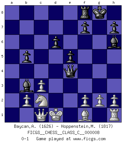 Last move : 0-1 2006 October 10 21:29:45 [Event "FICGS__CHESS__CLASS_C__000008"] [Site "FICGS"] [Date "2006.07.14"] [Round "1"] [White "Baycan,Alper"] [Black "Hoppenstein,Michael"] [Result "0-1"] [WhiteElo "1626"] [BlackElo "1817"] 1.e4 c5 2.Nf3 Nc6 3.d4 cxd4 4.Nxd4 Nf6 5.Nc3 e5 6.Ndb5 d6 7.Bg5 a6 8.Na3 b5 9.Bxf6 gxf6 10.Nd5 Bg7 11.c3 f5 12.exf5 Bxf5 13.Nc2 Be6 14.Nce3 Ne7 15.a4 Nxd5 16.Nxd5 O-O 17.axb5 axb5 18.Nb4 Rxa1 19.Qxa1 Qa8 20.Qc1 Qe4+ 21.Kd1 Bb3+ 22.Nc2 Bh6 0-1 Sicilian : Pelikan (Lasker/Sveshnikov) variation Kingside Castling by player Black (move 16) Player Black won this chess game. Follow this game move after move (download)The combination player thinks forward; he starts from the given position, and tries the forceful moves in his mind. (Emanuel Lasker) Es gibt keine einzige Frau, der ich nicht einen Springer vorgeben könnte und trotzdem gewänne. (Robert James Fischer) El Ajedrez es la vida. (Bobby Fischer) Tous ces prétendus hommes politiques sont les pions, les Cavaliers, les Tours ou les Fous d'une partie d'échecs qui se jouera tant qu'un hasard ne renversera pas l'échiquier. (Honoré de Balzac) Fortune favours the audacious. (Desiderius Erasmus)