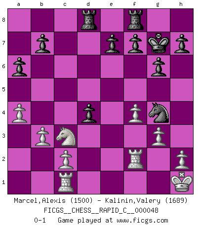 Last move : 0-1 2008 June 23 23:23:16 [Event "FICGS__CHESS__RAPID_C__000048"] [Site "FICGS"] [Date "2008.04.11"] [Round "1"] [White "Marcel,Alexis"] [Black "Kalinin,Valery"] [Result "0-1"] [WhiteElo "1500"] [BlackElo "1689"] 1.f4 d6 2.Nf3 Nf6 3.b3 g6 4.e3 Bg7 5.Bb2 O-O 6.Be2 c5 7.O-O Nc6 8.Nc3 a6 9.a3 Bf5 10.a4 d5 11.Na2 d4 12.Kh1 dxe3 13.dxe3 Qxd1 14.Bxd1 Rad8 15.g3 Ng4 16.Bxg7 Kxg7 17.Nc3 Nxe3 18.Rf2 Bg4 19.Rc1 Nd4 20.Nxd4 cxd4 21.Bxg4 Nxg4 0-1 Bird's Opening Kingside Castling by player Black (move 5) Kingside Castling by player White (move 7) Player Black won this chess game. Follow this game move after move (download)Chess demands total concentration. (Bobby Fischer) Als ich elf wurde, wurde ich einfach gut. (Robert James Fischer) El Ajedrez es imaginación. (David Bronstein) J'ai toujours senti une vague pitié pour l'homme qui ne connaît rien aux échecs, tout comme j'en aurais pour un homme ignorant de l'amour. Les Echecs, comme la musique ou comme l'amour, ont le pouvoir de rendre heureux. (Siegbert Tarrasch) Chess is everything: art, science and sport. (Anatoly Karpov)