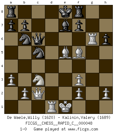 Last move : 1-0 2008 June 7 10:9:31 [Event "FICGS__CHESS__RAPID_C__000048"] [Site "FICGS"] [Date "2008.04.11"] [Round "1"] [White "De Waele,Willy"] [Black "Kalinin,Valery"] [Result "1-0"] [WhiteElo "1620"] [BlackElo "1689"] 1.e4 d5 2.exd5 Nf6 3.d4 Nxd5 4.Nf3 Nc6 5.c4 Nb6 6.d5 Nb4 7.a3 Na6 8.Nc3 e6 9.Qc2 exd5 10.cxd5 Be7 11.Bb5+ Bd7 12.Bd3 h6 13.Bh7 c6 14.dxc6 Bxc6 15.Bf4 Bxf3 16.gxf3 Nc5 17.Rd1 Qc8 18.Bf5 Qc6 19.Rg1 g6 20.Be5 Rf8 21.Rxg6 1-0 Scandinavian : Marshall variation Player White won this chess game. Follow this game move after move (download)I give 98 percent of my mental energy to Chess. Others give only 2 percent. (Bobby Fischer) Schach ist wie eine schöne Frau, zu der wir ständig zurückkehren, gleichviel, wie oft sie uns zurückweist. (Anonymous) La partida mas dura de ganar es una partida ganada. (Emanuel Lasker) Plusieurs personnes se sont demandées comment Tal faisait pour gagner... En fait, c'est très simple ! Il met ses pièces au centre de l'échiquier et les sacrifie quelque part ! (David Bronstein) To err is human, to shift the blame on someone else is tactical. (Mladen Jankovic)