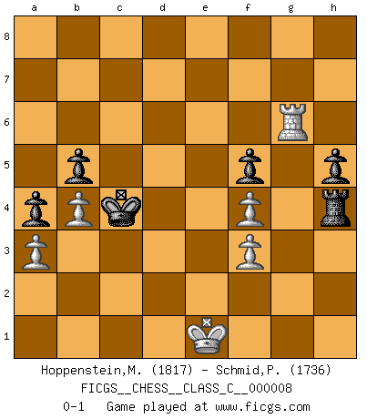 Last move : 0-1 2007 May 29 7:59:51 [Event "FICGS__CHESS__CLASS_C__000008"] [Site "FICGS"] [Date "2006.07.14"] [Round "1"] [White "Hoppenstein,Michael"] [Black "Schmid,Pablo"] [Result "0-1"] [WhiteElo "1817"] [BlackElo "1736"] 1.d4 Nf6 2.Nf3 g6 3.e3 Bg7 4.Bd3 d5 5.Nbd2 O-O 6.O-O c5 7.c3 Nbd7 8.b4 c4 9.Bc2 Qc7 10.Re1 e5 11.e4 exd4 12.Nxd4 Ne5 13.f4 Nd3 14.e5 Bg4 15.N2f3 Bxf3 16.gxf3 Nxe1 17.exf6 Bxf6 18.Qxe1 Rae8 19.Qd2 Bxd4+ 20.cxd4 f5 21.Qc3 Re2 22.Bd2 Qe7 23.Bd1 Re6 24.Ba4 Rb8 25.Kg2 b5 26.Bc2 a5 27.Kg3 a4 28.Rg1 Kh8 29.h4 Re8 30.Bd1 h5 31.a3 Kg7 32.Qc1 Kf7 33.Rf1 Re3 34.Rf2 Rd3 35.Bc2 Rxd2 36.Rxd2 Qe3 37.Rd1 Qxc1 38.Rxc1 Re2 39.Bd1 Ra2 40.Rc3 Rd2 41.Rc1 Rxd4 42.Be2 Rd2 43.Kf2 d4 44.Ke1 Ra2 45.Rd1 d3 46.Bxd3 cxd3 47.Rxd3 Ke6 48.Kf1 Rb2 49.Ke1 Rh2 50.Rc3 Rxh4 51.Rc6+ Kd5 52.Rxg6 Kc4 0-1 King's Indian : East Indian defense Kingside Castling by player Black (move 5) Kingside Castling by player White (move 6) Player Black won this chess game. Follow this game move after move (download)I am the best player in the world and I am here to prove it. (Bobby Fischer) Obendrein hat der FIDE-Präsident den Revolutionsführer Gaddafi zum »Großmeister« ernannt, am Ende der WM. Das ist lächerlich! (Joel Lautier) Botvinnik trató de alejar el misterio referente al Ajedrez, siempre relacionandolo a situaciones de la vida diaria. Solía llamar al Ajedrez un problema inexacto típico, similar a aquellos en que la gente tiene siempre que resolver a cada día. (Garry Kasparov) Roi des jeux et jeu des rois, les échecs portent en eux un sentiment d'infini. Ils donnent à celui qui s'est efforcé d'en approfondir les arcanes l'impression de n'être pas à la mesure de l'homme; en fait, ils constituent un résumé de l'univers, un microcosme, et figurent cette grande échelle qui, dans les plans de la lumière descend jusqu'à la matière, qui des abîmes insondables remonte jusqu'en l'infini de Dieu. (Pyrame) Everything in life is luck. (Donald Trump)